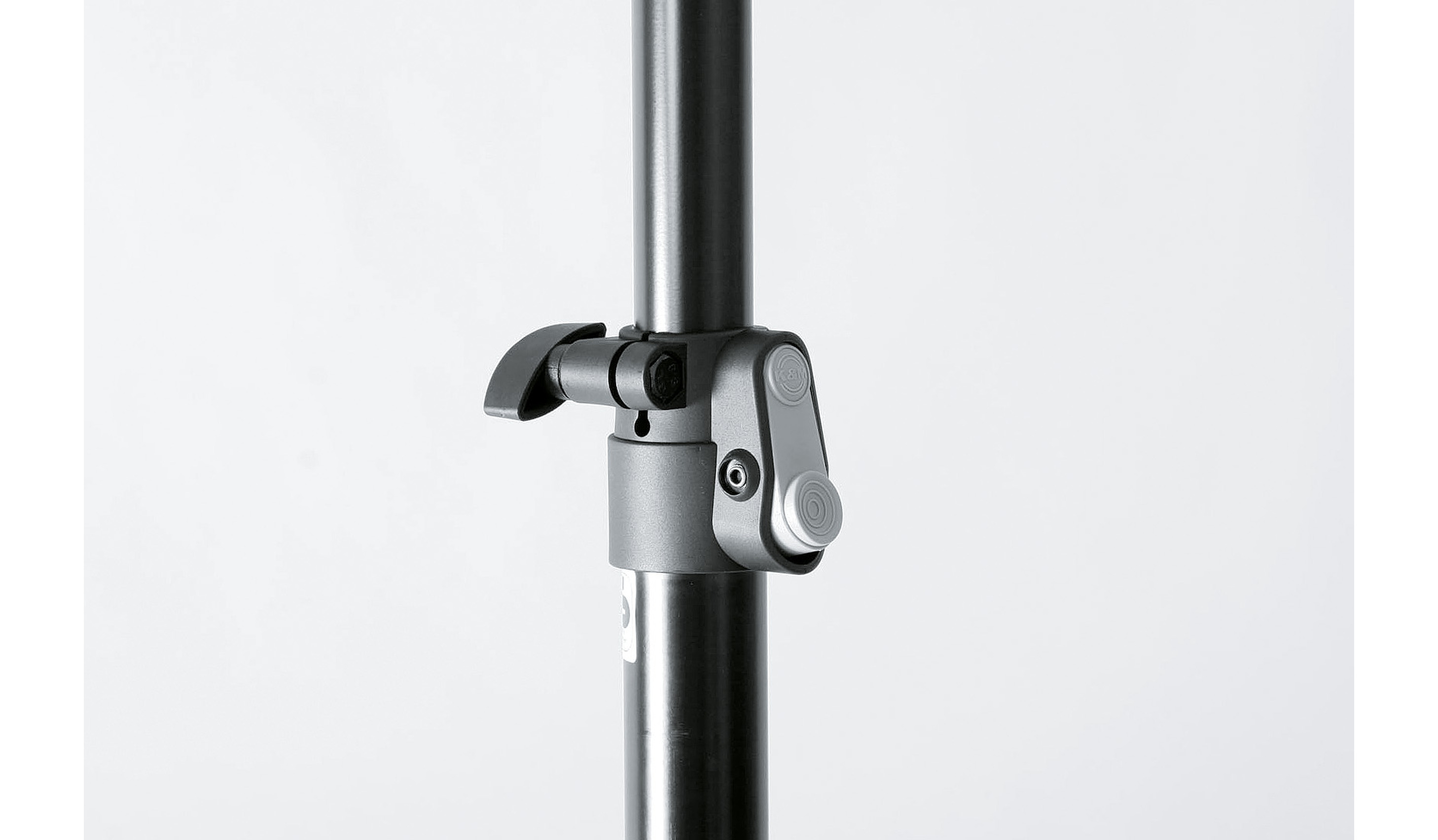 Zwei leicht zu transportierende K&M Boxenstative aus Aluminium in einer Tragetasche. Glasfaserverstärkte Verbindungselemente und die kompakte Spannschelle mit dem patentierten Druckknopfsystem ermöglichen die bedienerfreundliche Höhenverstellung des Stativs und sorgen für einen stabilen Halt der Box. Einstellung der Füße erfolgt mittels formschönem Klemmhebel.