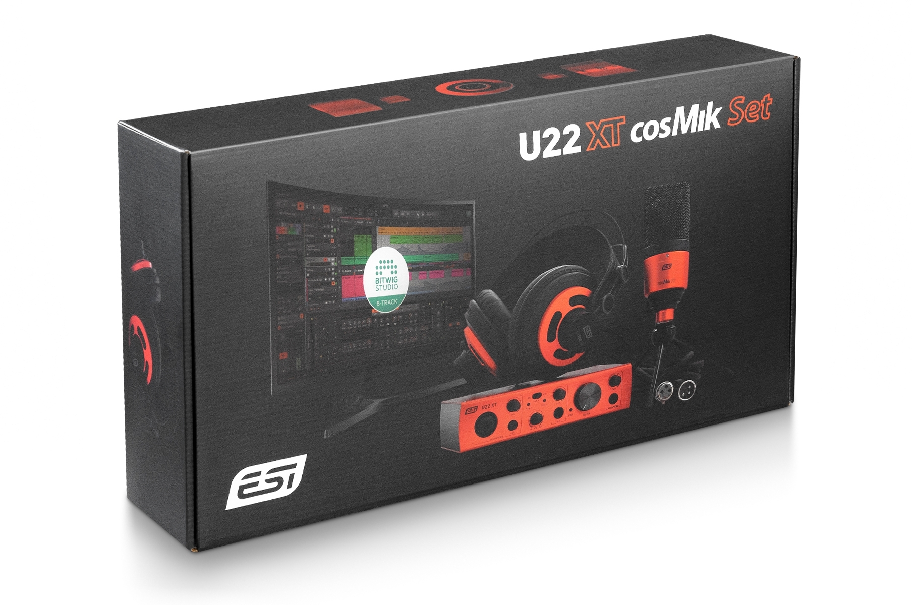 Das U22 XT cosMik Set besteht aus dem Audio-Interface U22 XT, dem Studio-Kondensatormikrofon cosMik 10 und dem Monitor-Kopfhörer eXtra 10. Außerdem im Paket: ein praktisches Tischstativ, ein Schaumstoffwindschutz und ein XLR-Kabel für das Mikrofon, ein USB-Kabel für das Audio-Interface sowie attraktive Gratis-Software (Bitwig Studio 8-Track, Deckadance LE, inTone 2 ESI Edition by Audified).