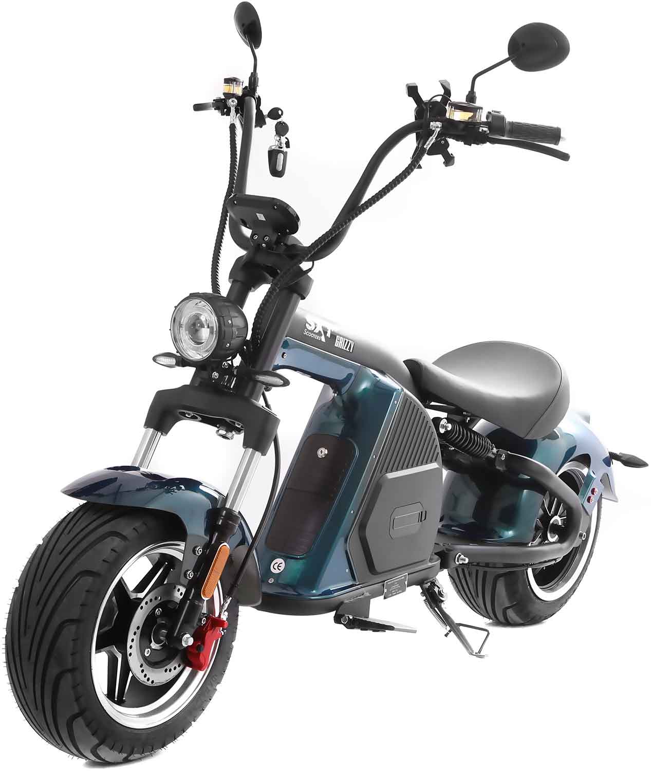 "Born to be wild" passt wohl wenn, dann am Besten zum neuen Schlachtschiff unserem SXT Grizzy. Mit seinem bulligen Design und der hohen Lenkerposition in Verbindung mit der riesigen Sitzfläche ist dieses Modell für die nächste Cruising Tour durch die Gegend wie maßgeschneidert. Der Elektroroller ist europaweit als Einsitzer straßenzugelassen und darf somit legal im Straßenverkehr mit einem Versicherungskennzeichen bewegt werden. Die LED Leuchten vorne wie hinten sorgen bei Tag wie bei Nacht für hervorragende Sichtverhältnisse und entsprechen dem aktuellen Standard. Die große 12 Zoll Bereifung in 165er vorne und 215er Breite hinten sorgen für ein äußerst stabiles Fahrverhalten. Die Federung des SXT Grizzy erfolgt über ein hydraulisches Federbein vorne sowie die Hinterradschwinge & Doppelstoßdämpfer hinten. Der Rahmen ist ein rostfreier hochwertiger und langlebiger Aluminiumrohrrahmen.