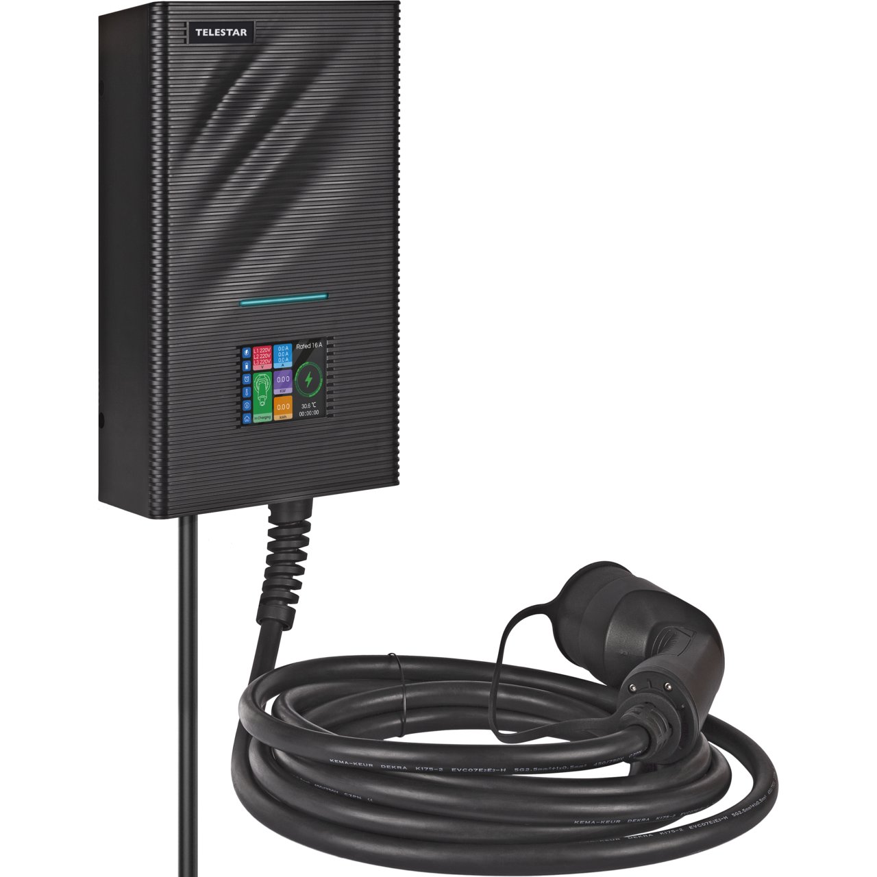 Die TELESTAR EC 311 S6 ist eine dreiphasige Wallbox und eignet sich zum Laden eines Elektro-/ Hybridfahrzeuges. Sie ist mit einem fest installierten, ca. 6m langen Ladekabel mit Typ 2-Stecker ausgestattet. Mit einer Leistung von max. 11kW bei 16A je Phase ist die EC 311 S6 KfW-förderfähig*. Die Ladezustände werden auf einem 3,5 Zoll LCD-Farbdisplay (Touch Screen) angezeigt. Ferner kann der Nutzer sich über den Google Play Store für sein Android Smart-Phone oder Tablet oder im Apple Store für seine iOS mobilen Geräte eine App kostenlos herunterladen die einen Vielzahl von Funktionen unterstützt. Das Gehäuse der Wallbox ist hitzebeständig und erfüllt die Anforderungen der Schutzklasse IP 66. Die Wallbox kann somit in einem Carport oder direkt an einer Hauswand oder freistehend installiert werden. *Die EC 311 S erfüllt die Kriterien der KfW für den Zuschuss 440 Ladestationen für Elektroautos Wohngebäude sowie für den Zuschuss 441 "Zuschuss für Ladestationen in Unternehmen und kommunalen Unternehmen, für freiberuflich Tätige und gemeinnützige Organisationen". LEISTUNGSMERKMALE
