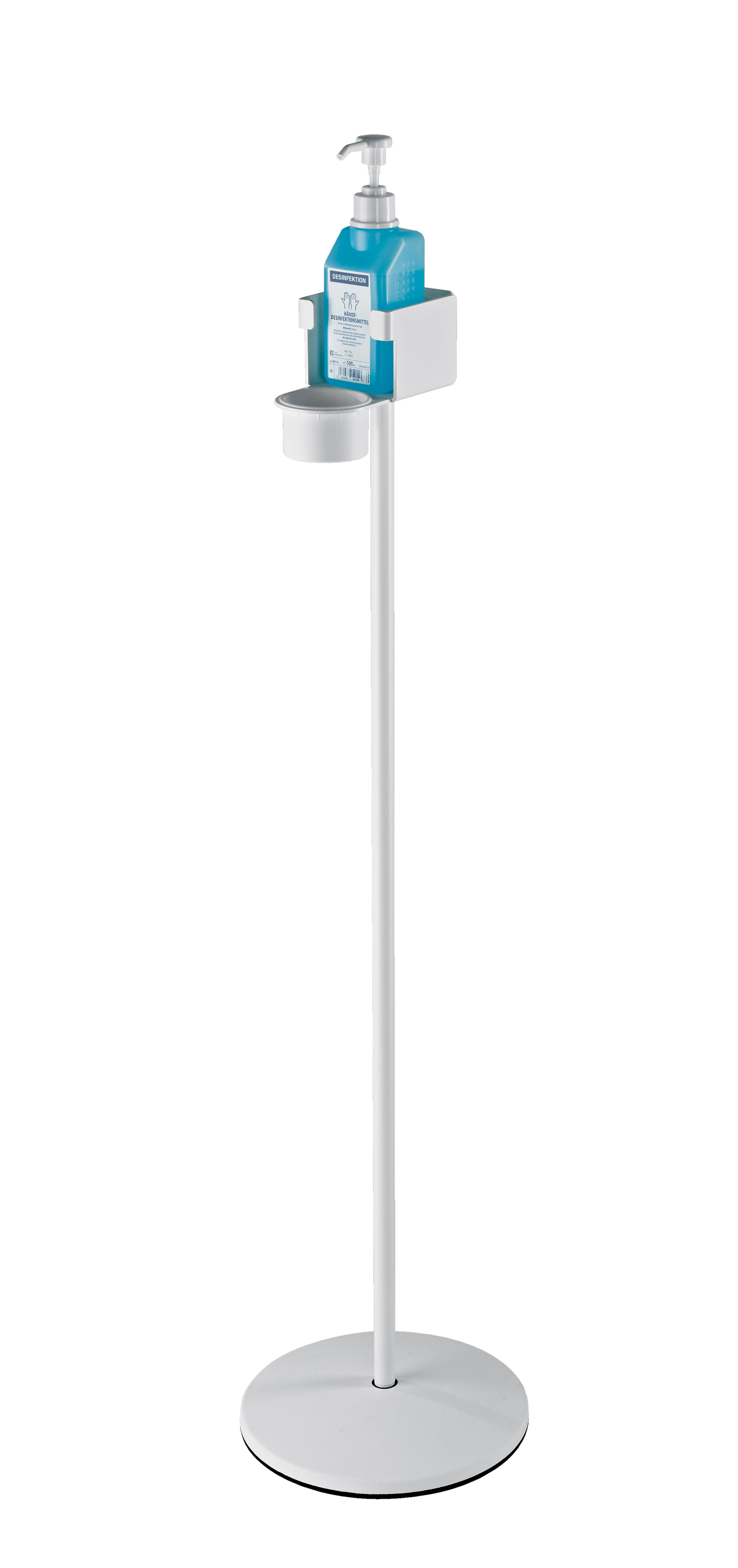 Rundsockel mit ø 275 mm und umlaufendem Bodenschutz aus Gummi. Stahlrohr weiß pulverbeschichtet. Höhe 1.020 mm. Abmessungen Flaschenhalter Innen 102 x 91 mm. Mit Klemmbügel zum Fixieren der Desinfektionsflasche. Die Kunststoff-Tropfschale kann zur Reinigung entnommen werden. Bitte beachten Sie, dass es sich bei dem Stativ um kein medizinisch zertifiziertes Produkt handelt. Desinfektionsmittel nicht im Lieferumfang enthalten.