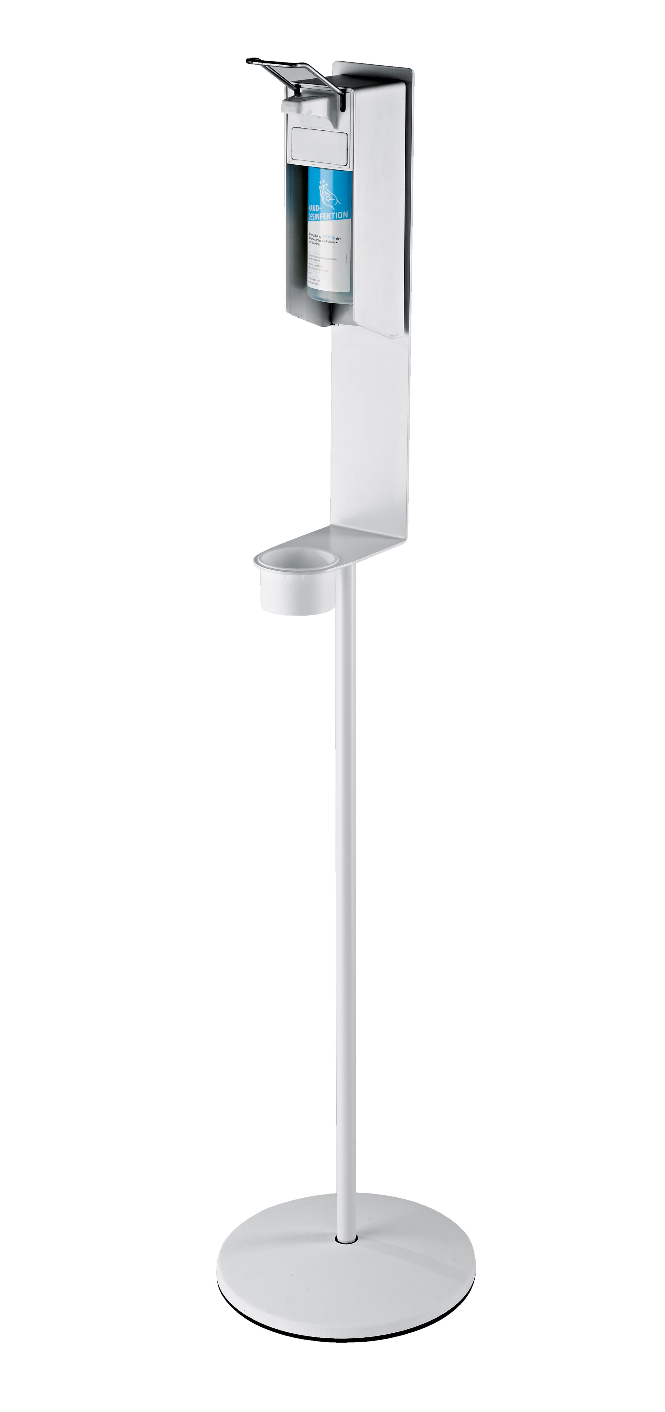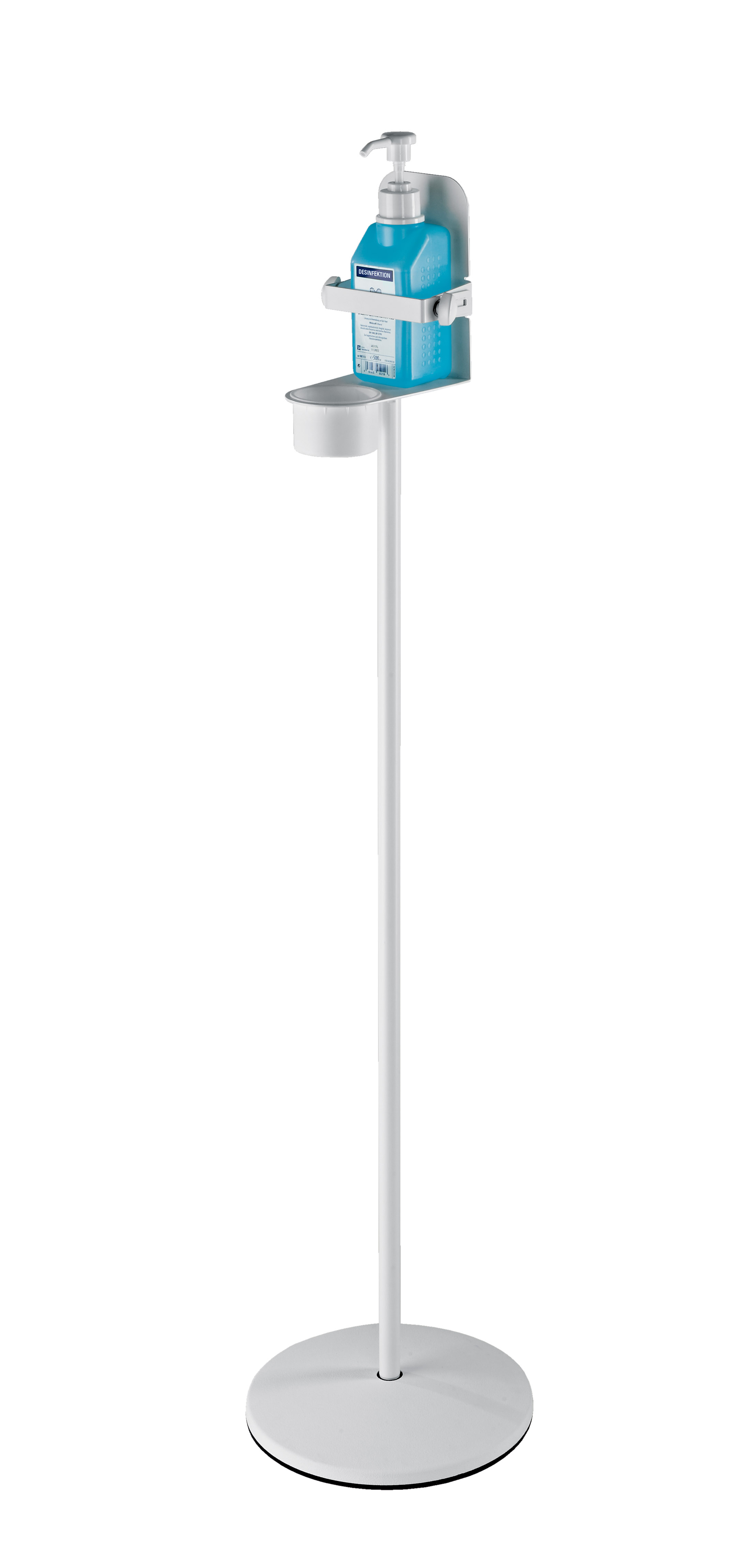 Rundsockel mit ø 275 mm und umlaufendem Bodenschutz aus Gummi. Stahlrohr weiß pulverbeschichtet. Die Kunststoff-Tropfschale befindet sich auf einer Höhe von 820 mm und kann zur Reinigung entnommen werden. Die stabile Spenderhalterung aus pulverbeschichtetem Metall ist hygienisch leicht zu reinigen und ist mit zwei verschiedenen Bohrbildern ausgestattet. So können Eurospender für Behältnisse mit 350/500 ml und 1.000 ml befestigt werden. Bitte beachten Sie, dass es sich bei dem Stativ um kein medizinisch zertifiziertes Produkt handelt. Desinfektionsmittel nicht im Lieferumfang enthalten.
