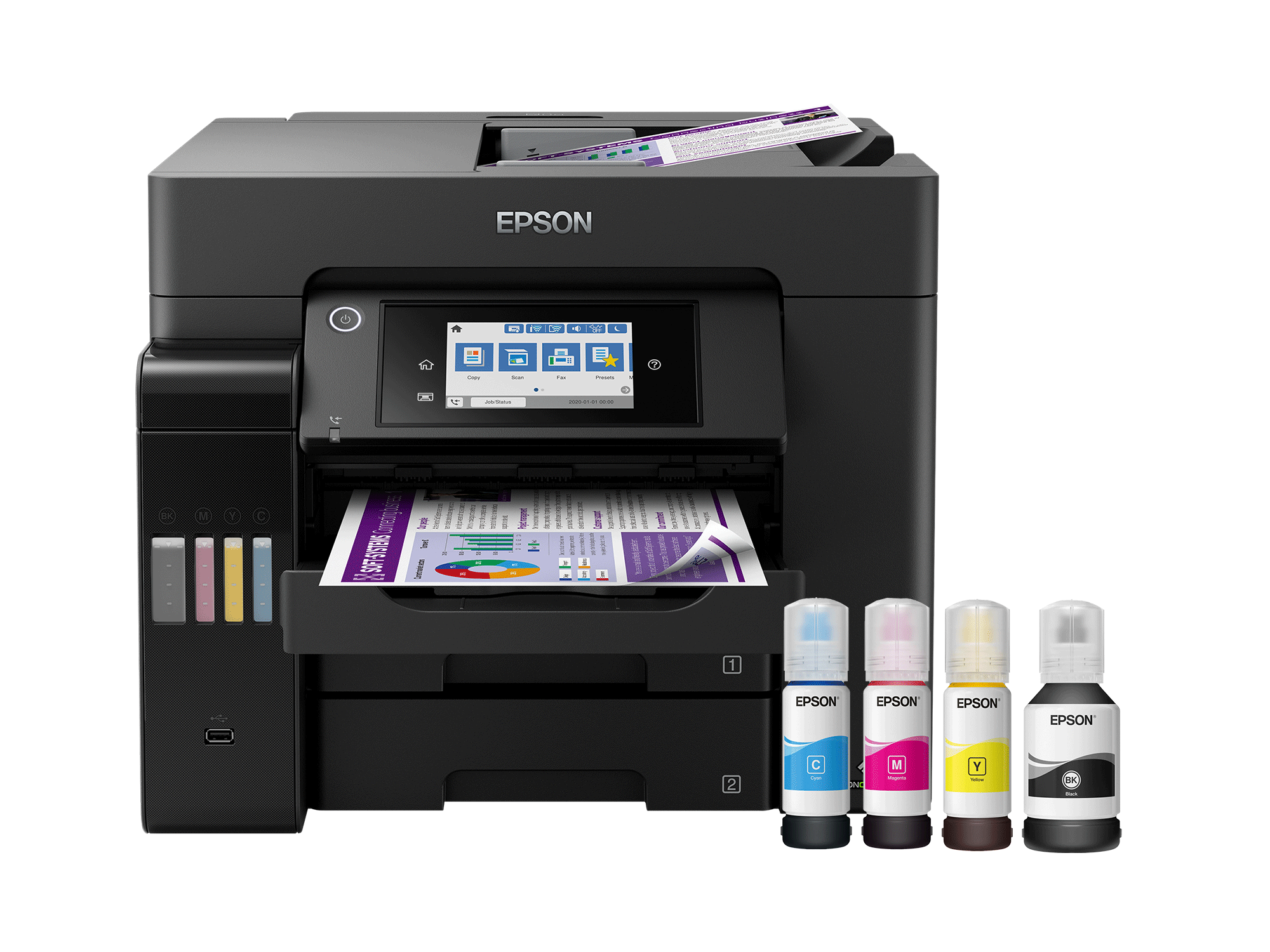 Der ET-5850 wird mit Tinte für bis zu 4.500 / 2.800 Seiten in s/w bzw. Farbe ausgeliefert. So können Sie lange Zeit drucken, ohne Tinte nachfüllen zu müssen. Das spart nicht nur Zeit, sondern senkt dank niedriger Seitenpreise Ihre Druckkosten um bis zu 90 %. Und wenn die Tinte doch einmal zur Neige geht: Sie erhalten Epson Original Tinte in kostengünstigen Nachfüllflaschen.