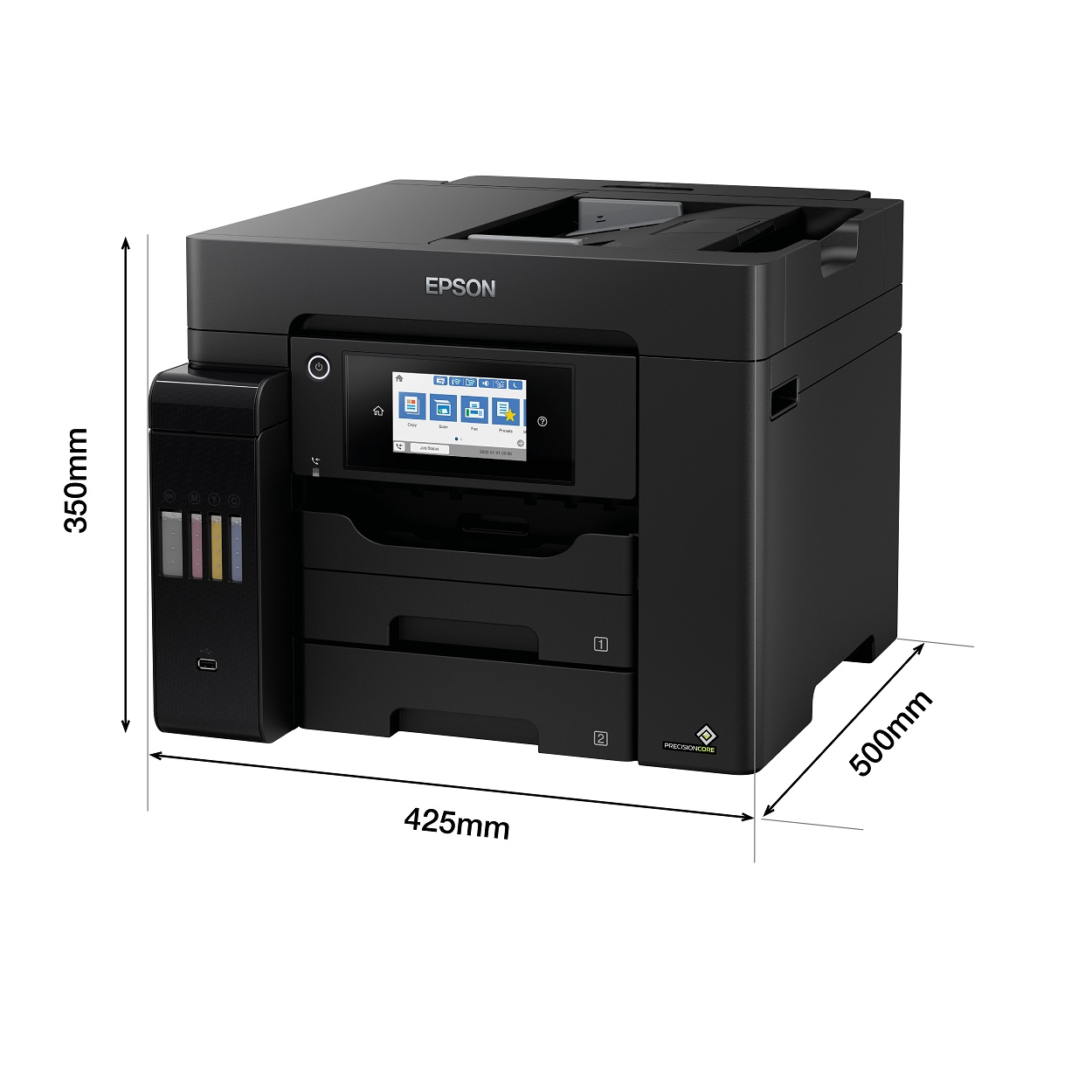 Mit diesem benutzerfreundlichen EcoTank-Modell erledigen Sie Ihre Druck-, Scan-, Kopier- und Faxaufträge im Handumdrehen und sparen dabei nicht nur Zeit, sondern auch Geld dank besonders niedriger Seitenkosten. Neben hohen Druck- und Scangeschwindigkeiten für Formate bis DIN A4 sorgen zwei vordere Papierkassetten für je 250 Blatt sowie ein hinterer Papiereinzug und ein ADF (automatischer Dokumenteneinzug) für je 50 Blatt für zusätzlichen Druckkomfort. Zahlreiche weitere Features wie mobiles Drucken, Ethernet oder ein 10,9 cm großer LCD-Touchscreen erleichtern Ihnen Ihren Arbeitsalltag.
