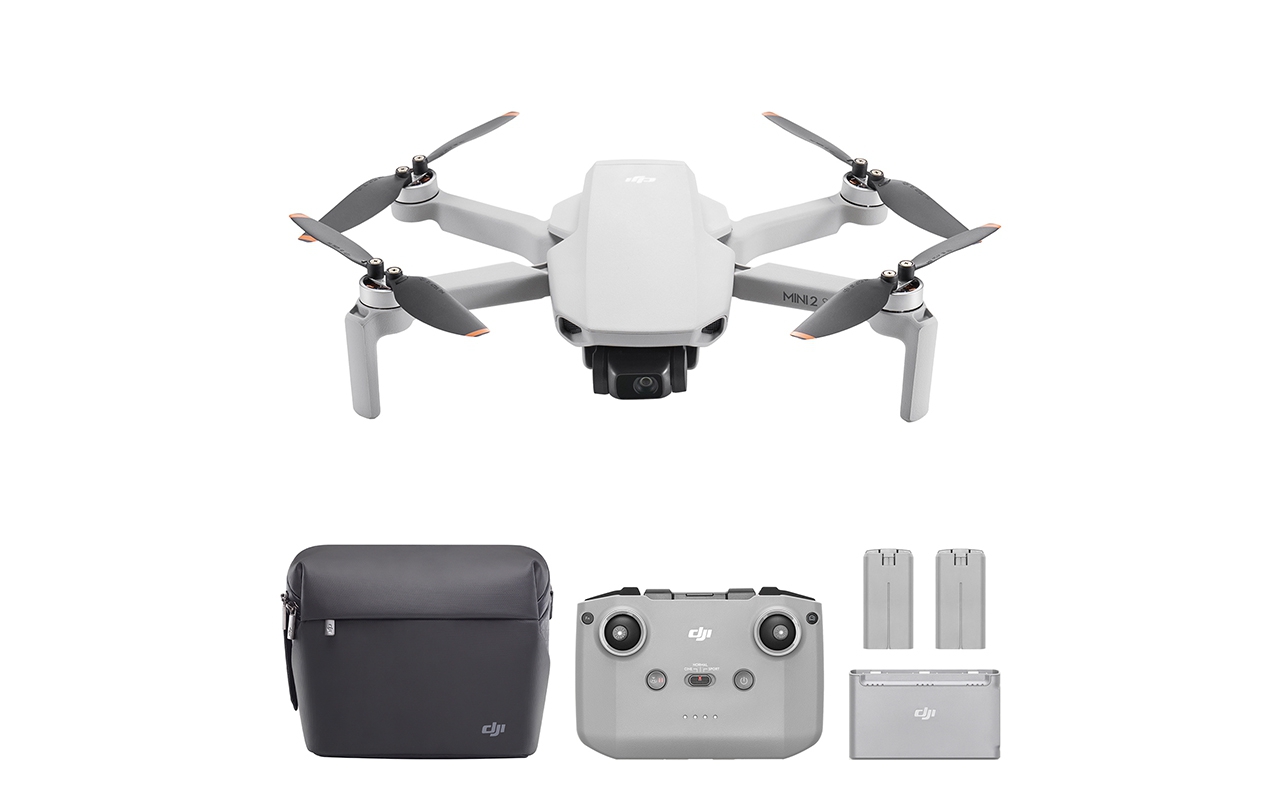 Die DJI Mini 2 SE Fly More Combo enthält zusätzlich zwei Intelligent Flight Batteries, zwei Paar Ersatzpropeller, eine Umhängetasche, eine Zweiwege-Ladestation und einen Propellerhalter.