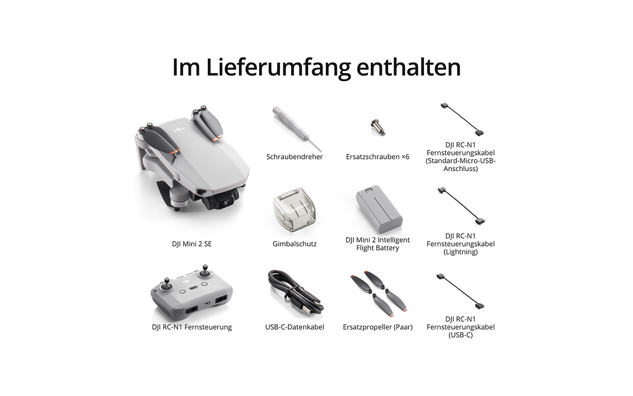 DJI Mini 2 SE ist in zwei Versionen erhältlich. DJI Mini 2 SE: Diese Standardversion enthält die Mini 2 SE Drohne, die RC-N1 Fernsteuerung und alles Zubehör, das zum Fliegen benötigt wird.