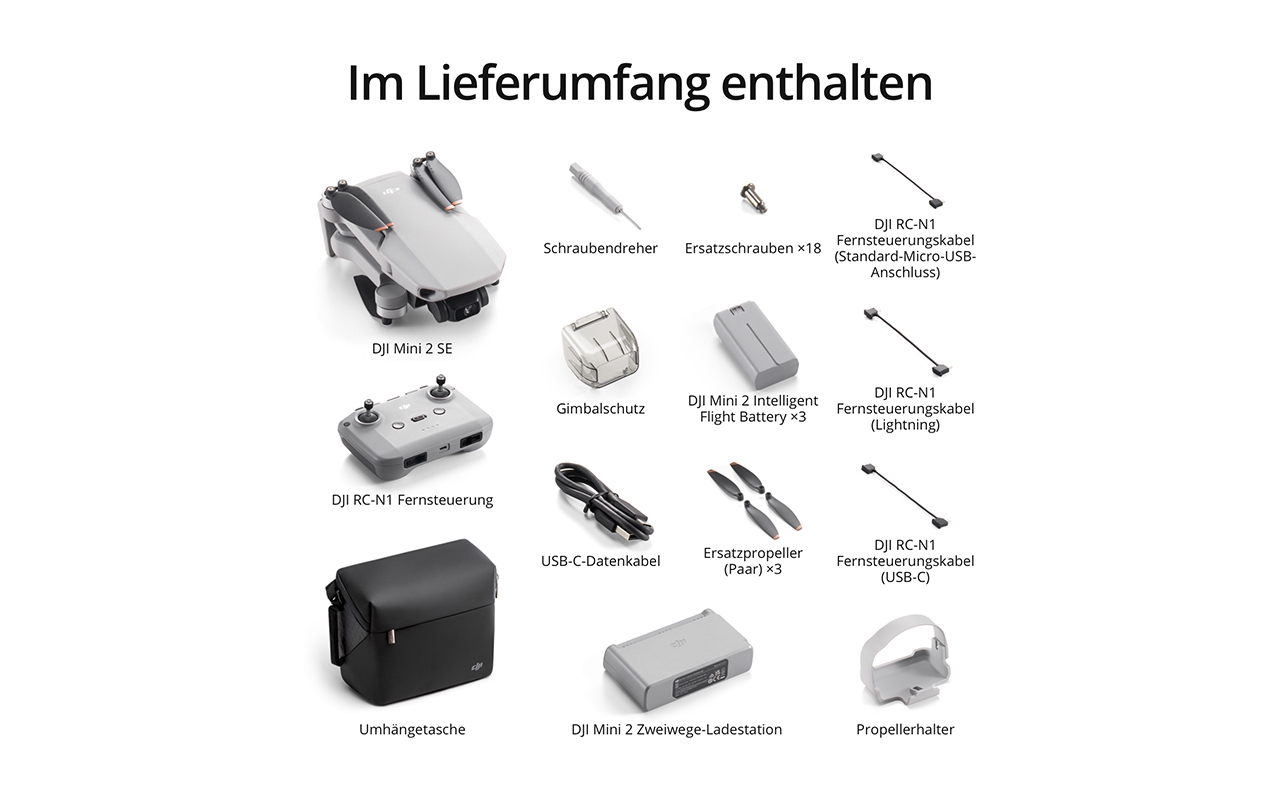DJI Mini 2 SE ist in zwei Versionen erhältlich. DJI Mini 2 SE: Diese Standardversion enthält die Mini 2 SE Drohne, die RC-N1 Fernsteuerung und alles Zubehör, das zum Fliegen benötigt wird.