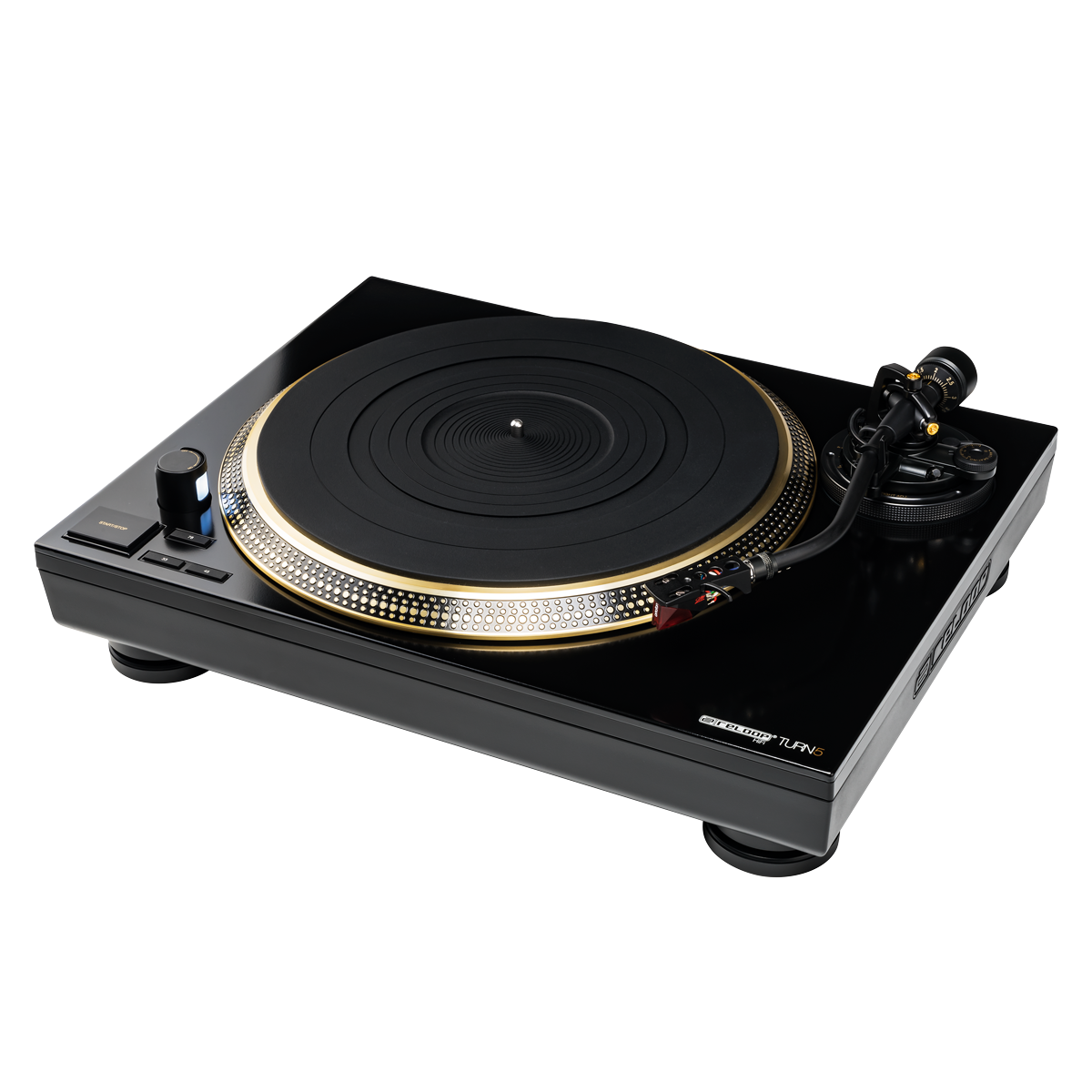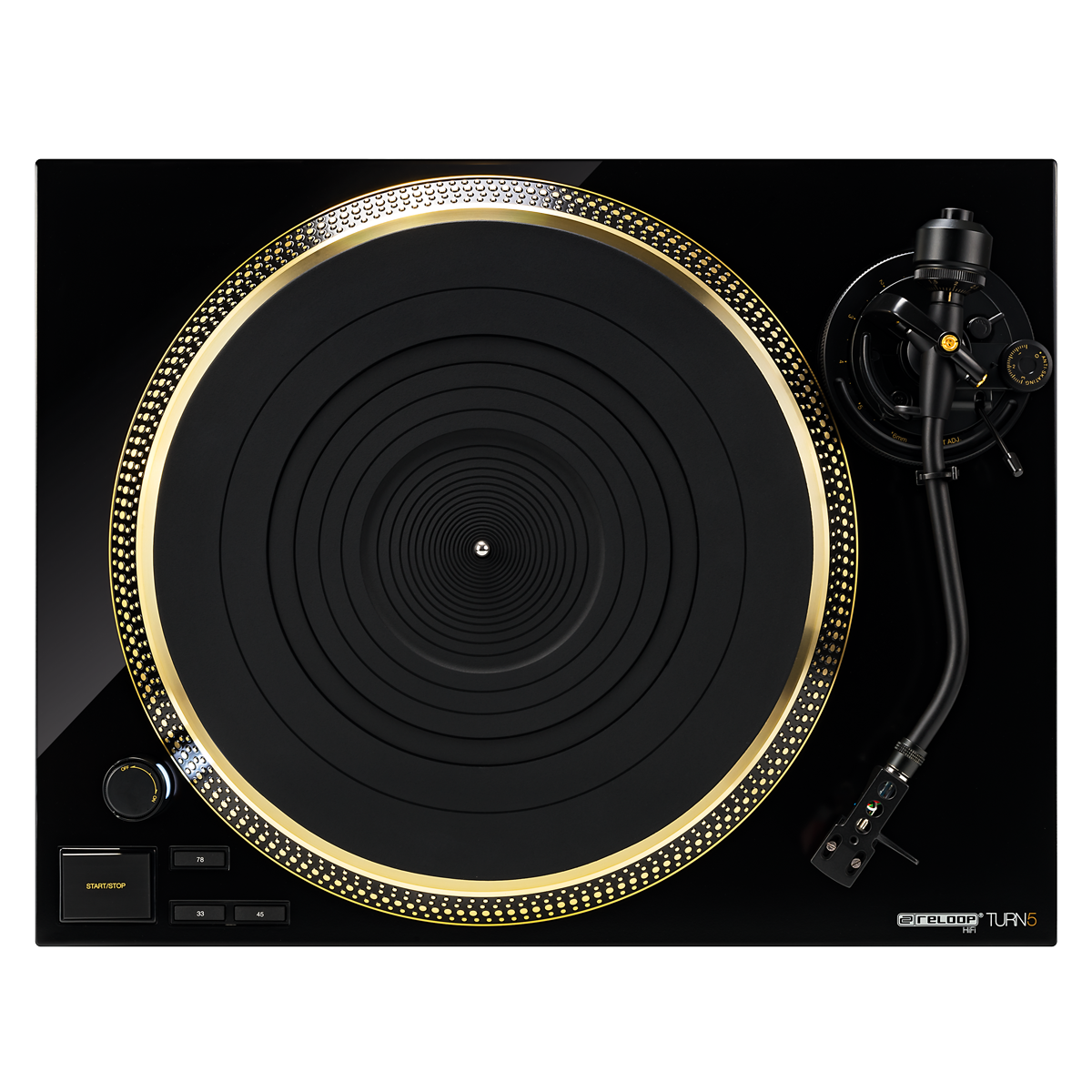 • Elegantes Design in sattem, schwarzen Klavierlack mit vergoldetem Plattenteller