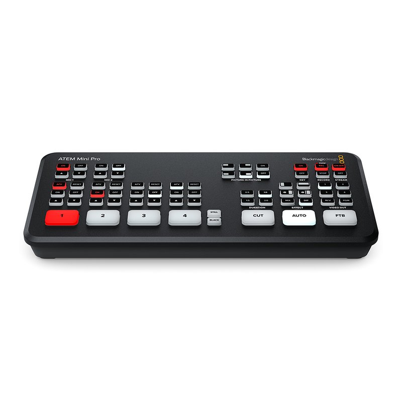 Der ATEM Mini Pro von Blackmagic Design ist fix eingerichtet und bedienfreundlich. Seine Features umfassen vier skalierbare HDMI-Eingänge, einen USB-Webcam-Ausgang, einen HDMI-Ausgang und einen Fairlight Audiomixer mit EQ und Dynamiktools, einen DVE-Prozessor für Bild-im-Bild-Darstellungen, Übergangseffekte, einen Greenscreen-Chromakeyer und einen 20 Standbilder fassenden Media Pool für Titel. Obendrein gibt es die ATEM Software Control kostenfrei dazu.