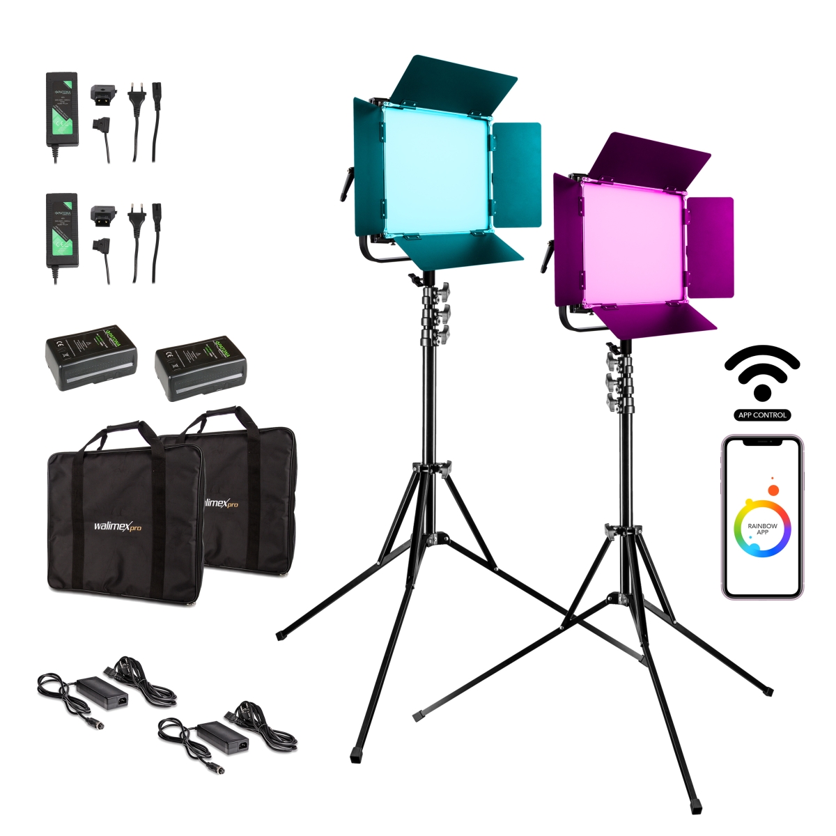 Set aus 2x Walimex pro LED Rainbow 100W RGBWW Flächenleuchte sowie 2x Walimex pro GN-806 Lampenstativ 215 cm, 2x V-Mount Akku 190 Wh / 14,4 V / 13.200 mAh, 2x V-Mount Premium Ladegerät.