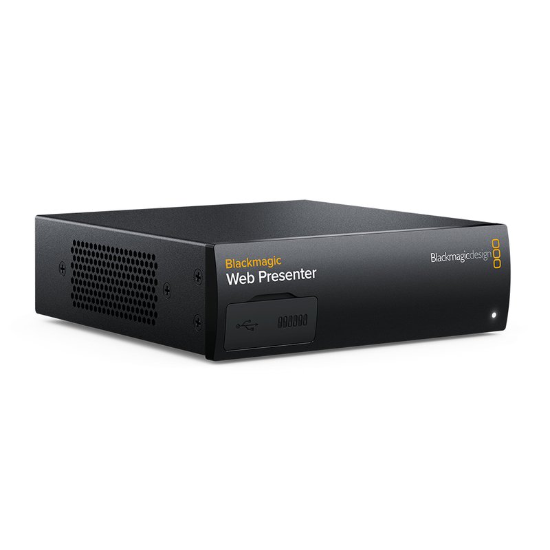 Web PresenterDer Blackmagic Web Presenter tarnt jede SDI- oder HDMI-Videoquelle als USB-Webcam, mit der Sie qualitativ hochwertige Inhalte über Skype oder Streaming-Plattformen wie YouTube Live, Facebook Live, Twitch.tv, Periscope usw. im Internet verteilen können.Der Blackmagic Web Presenter hat 12G-SDI- und HDMI-Eingänge, einen XLR-Mikrofonanschluss, einen HiFi-Audioeingang, einen Downkonverter in Teranex-Qualität und einen Livemischer mit zwei Eingängen, sofern er zusammen mit dem optionalen Teranex Mini Smart Panel verwendet wird.Anschlüsse: