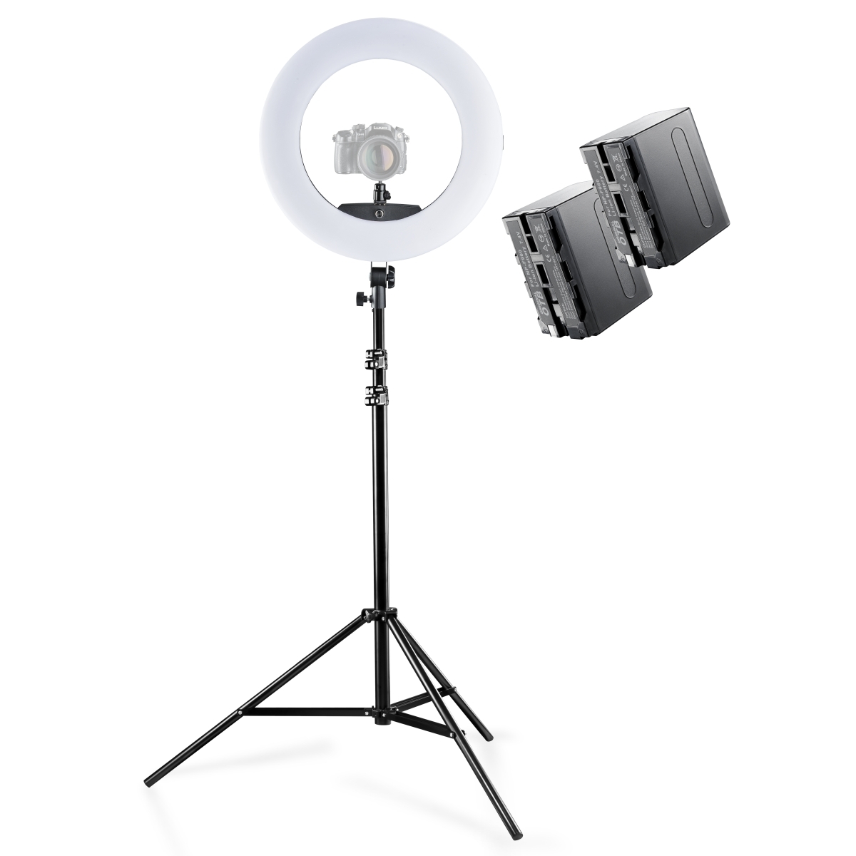 Set aus LED Ringleuchte für Foto und Video plus 2 NP-F-Akkus plus stabilem Lampenstativ