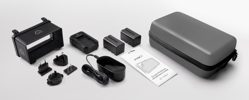 Das Atomos 5" Accessory Kit für den Ninja V und Shinobi beinhaltet: Sonnenblende, Displayschutz, DC Netzteil, Schnellladegerät, zwei NP-F750 5200 mAh und ein EVA Case.