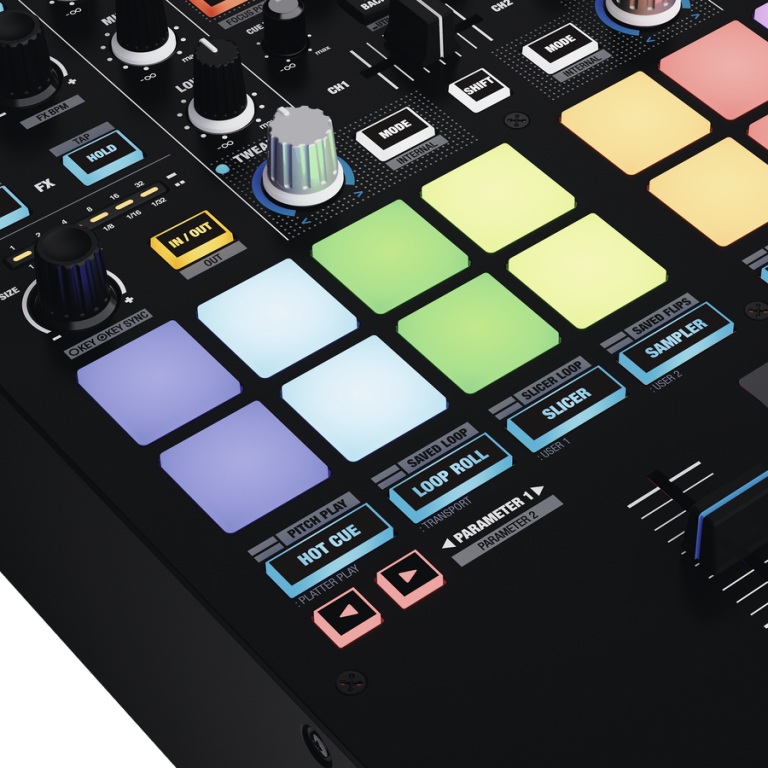 • 4 Modi-Taster, drei Ebenen mit 12 Performance-Modi (Hot Cue, Loop Roll, Slicer, Sampler, Pitch Play, Saved Loop, Slicer Loop, Saved Flips, Platter Play, Transport, 2 User-Modi) und Dual Layer Parameter-Taster pro Seite