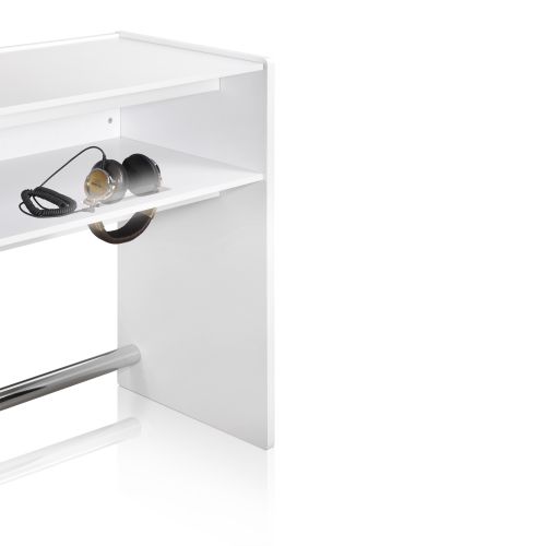 Die DJ-Theke von Zomo ist die perfekte Lösung sowohl für das schicke DJ-Setup zuhause als auch für den professionellen Einsatz im Club. Der Zomo Ibiza Deck-Stand bietet ausreichend Platz für 2 Plattenspieler oder CD-Player und einen Mixer bis 19 Zoll Breite. Natürlich finden die Plattenspieler sowohl in der Standart-Stellung als auch in der Battle-Stellung genug Platz. In der 2. Etage ist zudem noch ausreichend Platz für diverse 19 Zoll Geräte wie etwa einen Verstärker oder einen 19 Zoll Cd-Player. Zudem sind in diesem Fach 2 Kopfhörer-Halterungen integriert. Sie stellen mit ihrer hochwertigen Oberfläche einen echten Blickfang dar.