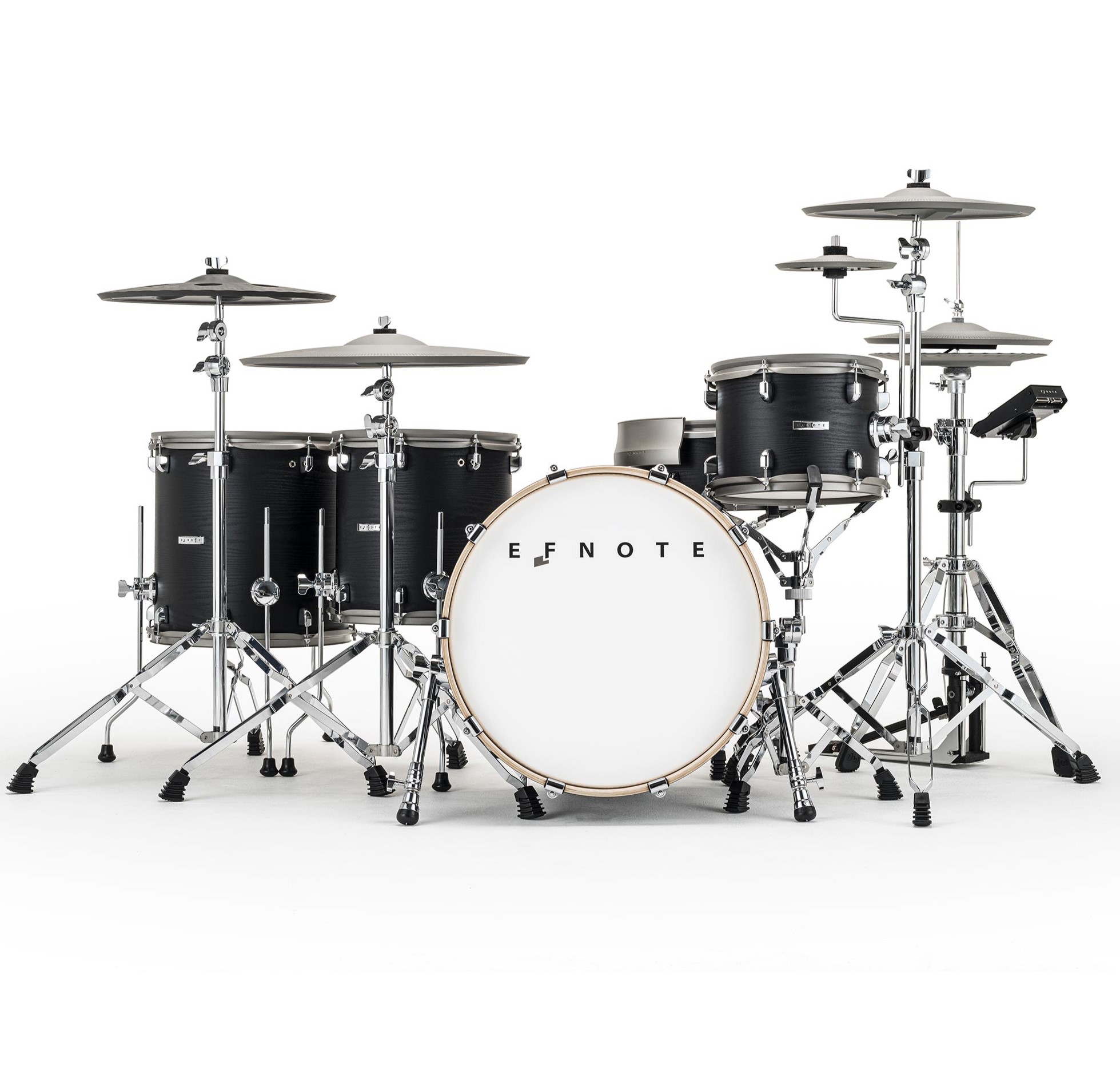 Das 5-teilige EFNOTE 5 setzt mit seinem exzellenten Klang, den außergewöhnlichen Pads und einem noch nie da gewesenem Hardware-Design neue Standards. Das EFNOTE 5 ist eine absolute Weltneuheit - erlebe eine neue Dimension im E-Drum Sektor! Für den überragend naturgetreuen Sound sorgen aufwendig produzierte Multilayer Samples. Jeder der 98 Werkssound besteht aus 127 Einzelsamples, wodurch eine außergewöhnlich hohe Dynamik erreicht wird. Die Sounds sind alle editierbar, für eigene Kreationen sind 128 User-Speicher vorhanden. Das kompakte Sound Modul hat ein stabiles Metallgehäuse und wird über ein Touch Screen LC-Display bedient. Mit seinem übersichtlich strukturierten Menü ist selbst ungeübten Nutzern ein schneller Zugriff auf alle Funktionen und Einstellungen möglich. Die Sounds lassen sich stimmen (Tuning), abdämpfen (Muffling) und klangregeln (EQ). Außerdem hat man ein virtuelles Mischpult, über das sich die Sounds individuell in der Lautstärke regeln und beliebig auf die Ausgänge routen lassen. Das integrierte Metronom und die Rhythm Box sind ideal zum Üben. Außerdem kann man Songs und Play-Alongs auch über Bluetooth ins Modul streamen. Das EFNOTE 5 Modul hat auch ein eingebautes USB Audio Interface, über das 8 Spuren digital zum Rechner übertragen werden können. Zusätzlich hat man 2 Analog-Ausgänge, das EFNOTE 5 eignet sich gleichermaßen für den Live- und den Studiobetrieb sowie für Unterrichtszwecke. Snare, Tom Tom und Stand Tom haben hochwertige, 6-lagige Birkenkessel, sind mit Mesh Heads bespannt und mit jeweils drei Sensoren ausgestattet. Mit dieser Multi-Trigger Technologie wird eine einmalig hohe Sensibilität und äußerst präzise Ansprache gewährleistet. Zusätzlich verfügt die Snare über eine dritte Spielfläche. Dies ermöglicht eine 100% genaue Trennung zwischen Cross Stick und Rim Shot. Ein fehlerhaftes Auslösen der Trigger ist somit absolut ausgeschlossen. Die 16 Bass Drum ist mit 2 Triggern bestückt und damit auch ideal für den Einsatz einer Doppelfußmaschine geeignet. Die Cymbal Pads, auch die Hi-Hat, sind 360° - also von allen Seiten bespielbar. Somit ist eine Vorrichtung, die das Verdrehen der Becken verhindert, nicht mehr notwendig. Bei den Crash und Ride Cymbals handelt es sich generell um Triple Zone Pads, bei denen sowohl der Rand, die Fläche als auch die Glocke bespielt werden können. Außerdem verfügen alle Cymbal Pads über eine Choke Funktion zum manuellen Abstoppen. Für ein akkurates und höchst sensibles Spielverhalten sorgt letztlich das innovative Hi-Hat Pedal, welches nicht über einen gewöhnlichen Schleifkontakt seine Position erkennt, sondern mit einem optischen Sensor arbeitet. Mit einem an dem Pedal angebrachtem Gewicht wird das Hi-Hat Top Cymbal imitiert und somit ein realistisches Spielgefühl erzeugt. Das EFFNOTE 5 wird mit doppelstrebigen Snare- und Beckenständern geliefert.