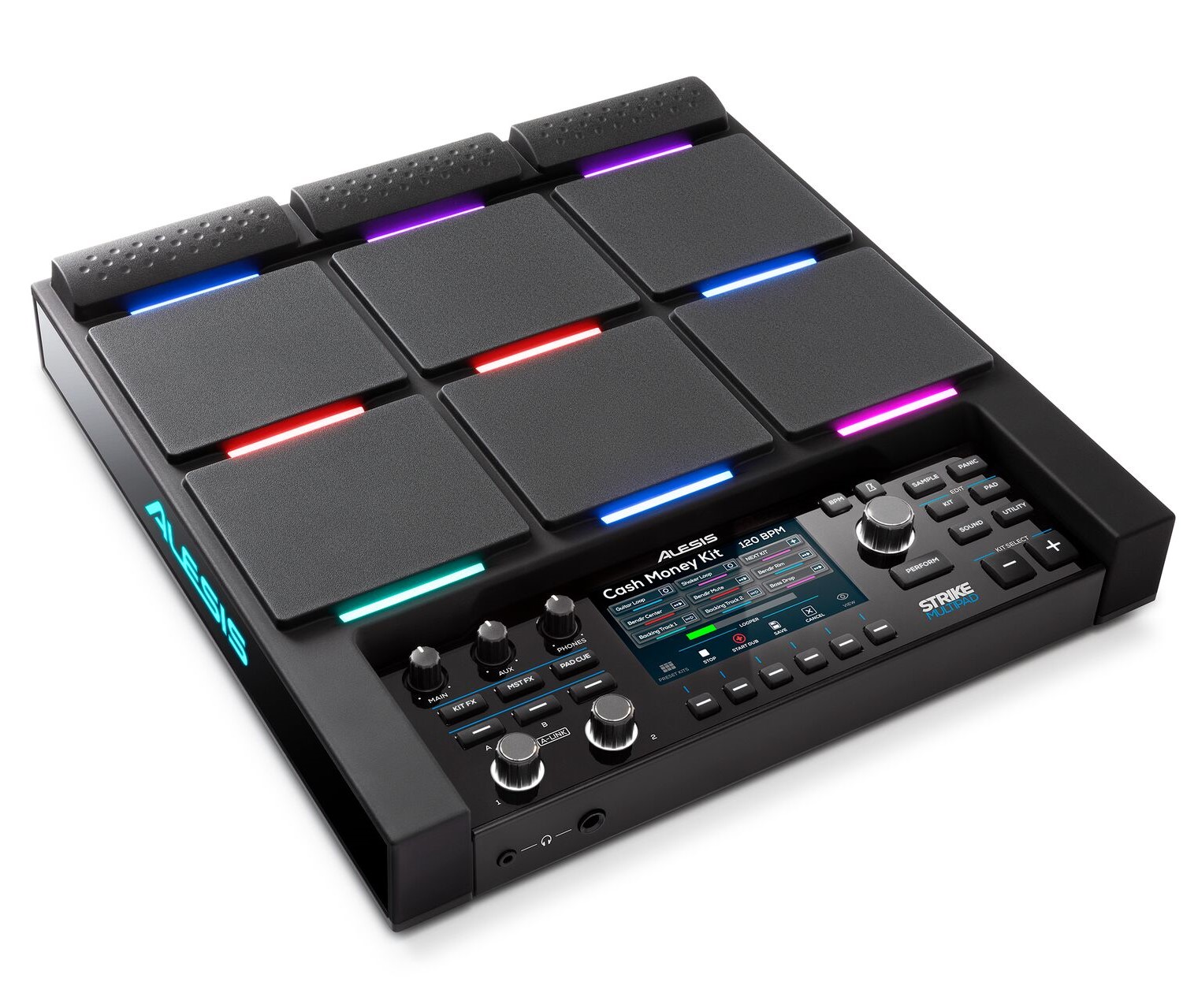 Alesis hat das Strike MultiPad auf Wunsch vieler Drummer entwickelt und das Resultat ermöglicht nun das Sampeln, Editieren, Loopen und Performen in einer nahtlosen Weise. Das Strike MultiPad verfügt über mehr als 7000 vorinstallierten Sounds, einer Speicherkapazität von 32 GB und die Möglichkeit Samples ganz einfach aufzuzeichnen (Smartphone, Mikrofon, über das Internet, via USB und über jede beliebige Audioquelle). Die insgesamt 9 anschlagdynamischen Pads verfügen über einstellbares RGB Licht und dieses kann ganz leicht dem eigenen Gusto angepasst werden. Dank des RGB Lichts unter jedem Pad ist garantiert, dass der Spieler keinen Takt mehr verfehlt – ganz egal, wie dunkel und neblig es auf der Bühne ist. Strike MultiPad verfügt über 5 integrierte Effekt Prozessoren und eine benutzerdefinierte Effektsteuerung, so dass der Nutzer ganz einfach seine Sounds und Loops personalisieren kann. Darüber hinaus gibt es mehrere Ein- und Ausgänge inklusive einem USB-Audio- und MIDI-Interface, mehrere externe Drums- / Cymbal-Trigger und ein exklusives 4,3“ Farbdisplay um ein visuelles Feedback des Systemstatus zu gewährleisten oder im Handumdrehen Änderungen vorzunehmen. Diese Art von MultiPad ist einfach einzigartig am Markt und bietet viele kreative Funktionen.