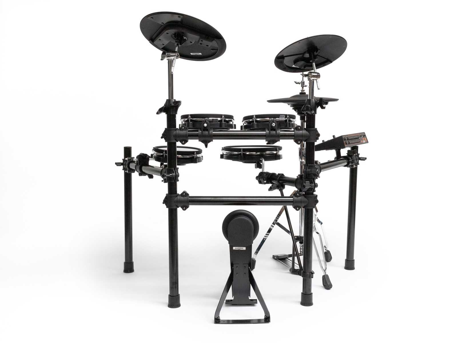 Professionelles, fünfteiliges Set mit 6 Kick, 10 Snare, drei 8 Toms, 12 Crash, 14 Ride und 13 Hihat. Toms und Snare sind 2-Zonen-Pads und mit Mesh Heads bestückt, das 2-Zonen-Crash und das 3-Zonen-Ride haben beide eine Choke-Funktion. Das kompakte und leicht zu montierende Rack benötigt eine Aufbaufläche von lediglich 1,20 x 0,70 m. Im Lieferumfang sind alle nötigen Halterungen und Anschlusskabel.