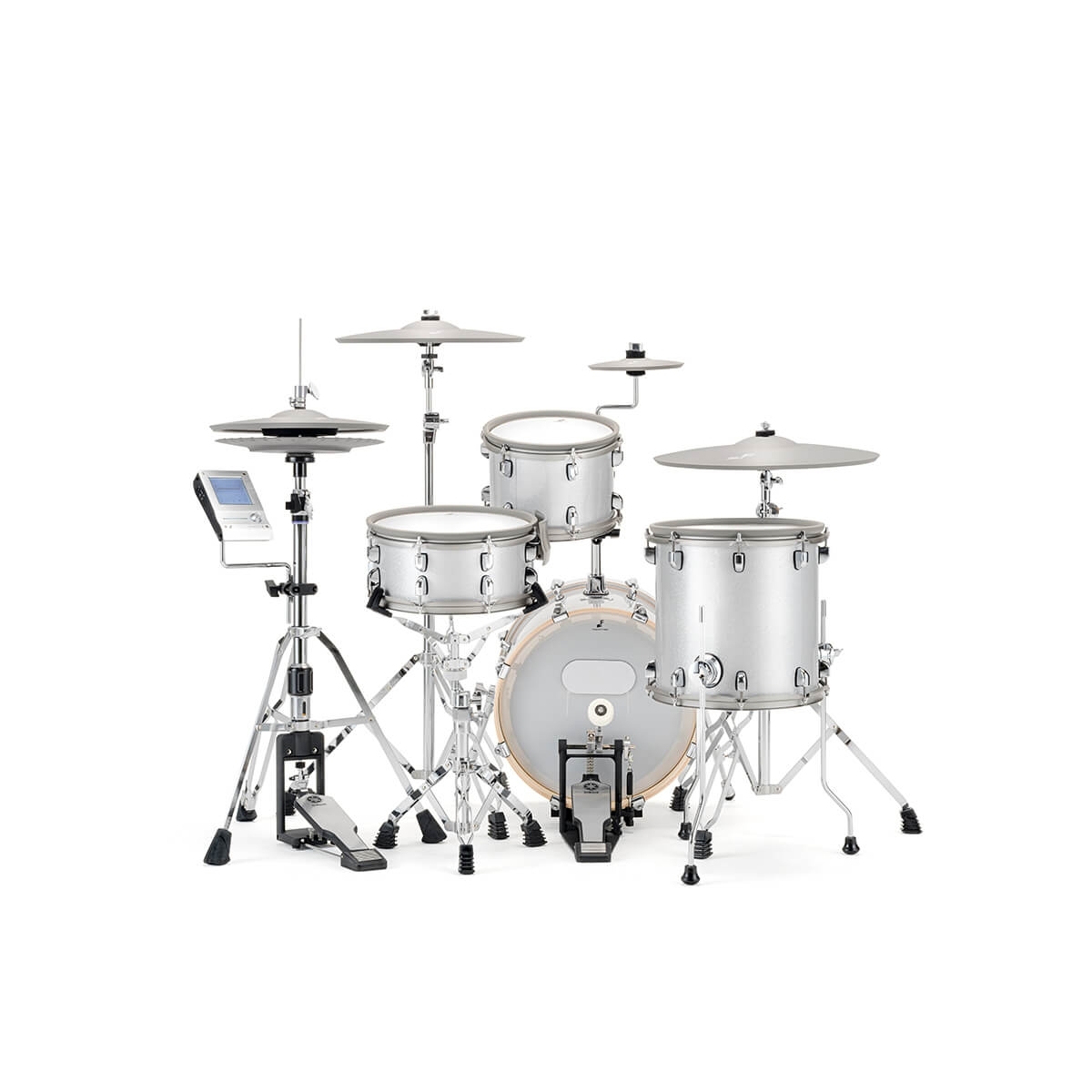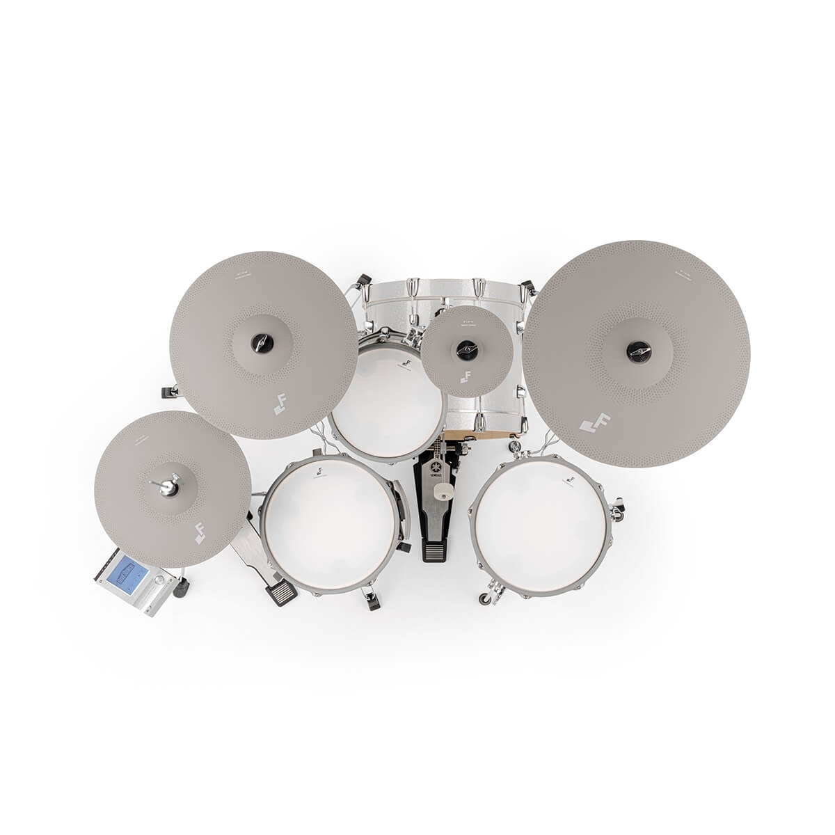 Snare, Tom Tom und Stand Tom haben hochwertige, 6-lagige Birkenkessel, sind mit Mesh Heads bespannt und mit jeweils drei Sensoren ausgestattet. Mit dieser Multi-Trigger Technologie wird eine einmalig hohe Sensibilität und äußerst präzise Ansprache gewährleistet. Zusätzlich verfügt die Snare über eine dritte Spielfläche. Dies ermöglicht eine 100% genaue Trennung zwischen Cross Stick und Rim Shot. Ein fehlerhaftes Auslösen der Trigger ist somit absolut ausgeschlossen. Die 16 Bass Drum ist mit 2 Triggern bestückt und damit auch ideal für den Einsatz einer Doppelfußmaschine geeignet.