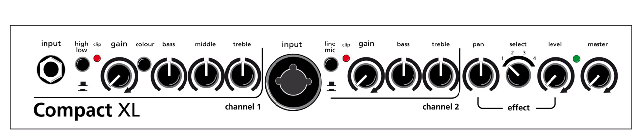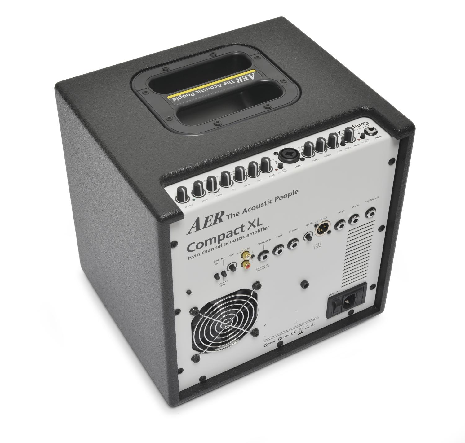 Zweikanaligern Akustikgitarrenverstärker mit einer Leistung von 200 Watt, kombiniertem XLR/6,3 mm Klinkeneingang und einem zweiten 6,3 mm Klinken-Input. Beide Kanäle verfügen dabei über eigene Gain-Regler und eine eigene Klangregelung. Abgerundet wird der AER Compact XL durch vier integrierte Effekte und Anschlüsse für Fußschalter, Stimmgerät, Kopfhörer und einen D.I. Ausgang.