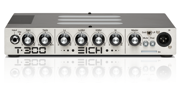 Der neue EICH T-1000Classic ist extrem klein in den Abmessungen, aber ganz groß im Sound. Durch die Verwendung hochwertigster Bauteile deckt das kompakte Klangwunder alle Frequenzbereiche ab und überzeugt mit kraftvollem Grundsound. Die exklusiven Features in Verbindung mit unserer neuen ultralinearen High-End Eingangsstufe definiert neue Maßstäbe in dieser Amp-Liga. Durch die effektiven Klangregelmöglichkeiten werden alle Stilrichtungen hervorragend übertragen. Die T-Serie besticht durch ihre Vierband-Klangregelung, mit der auf einfache Weise eine Vielzahl unterschiedlicher Sounds eingestellt werden kann. Der »Taste«-Regler erlaubt es, das Timbre des Instruments zu charakterisieren. In Mittelstellung verhält sich der Ton neutral. Dreht man nach links, wird Tiefbass herausgefiltert und charaktervolle Mitten werden hervorgehoben. Der ultimative Fretless-Regler. Im Uhrzeigersinn gedreht, werden die oberen Frequenzen abgemildert, was einen pumpenden Basssound erzeugt. Effectweg, Tuner Out, Line Out, Line In und drei Speakon® Ausgänge sowie ein DI mit Pre/Post-Schalter und Ground Lift-Schalter zeigen die vielfältigen Anschlussmöglichkeiten auf. Ein flüsterleiser, luftstromoptimierter Lüfter mit temperaturabhängiger, analoger Steuerung  im T-1000 lassen den Amp auch bei Vollast immer Cool bleiben. Mit seinen magnet fix pins fixiert sich der T-1000 sicher auf den AmpFixing-Schienen unserer Cabinets. Ideal zum Traveling around the World zeigt sich der Spannungswahlschalter, mit dem zwischen 230 V und 115 V umgeschaltet werden kann. Der T-1000 ist außerdem mit dem neu entwickelten Kompressor ausgestattet, der feinste Dosierungen ohne Pegeleinbruch erlaubt. Zudem kann zwischen einer langen oder kurzen Attack-Zeit umgeschaltet werden, was weitere beeindruckende Klangvariationen ermöglicht. Effect Mix und Line In können bequem vom Frontpanel aus eingestellt werden. Außerdem steht ein Fußschalter-Anschluss für die Mute- und Compressor-Funktion zur Verfügung. Zusätzlich können zur Erweiterung der Klangregelung je ein Boost-Schalter für Bass und Höhen aktiviert werden. Das Ergebnis ist eine beeindruckende Live-Performance bei unschlagbarem Leistungsgewicht. Mit der getrennt regelbaren 2 x 500 Watt oder 1 x 1000 Watt starken Digitalendstufe des T-1000 kann man so ziemlich alle Bühnen der Welt entspannt mit Bass versorgen. Mit der EICH T-Serie verbinden sich enorme Kraft und elegante Leichtigkeit zu einer völlig neuen Verstärkergeneration.   Extremely lightweight Ultra compact Switching power supply Class-D Poweramp DAS Direct-Airflow-System Magnet Fix pins (nicht für die USA verfügbar) »Taste«-Filter 4-band EQ pre/post »DI out« Transformer balanced »DI out« Ground Lift switch 115 / 230V switch Compressor with switchable »Attack Time« »Bass Boost« and »Hi Boost« switch »Mute« & »Compressor« -footswitch-connection CH-B with 200 Hz »Lo Pass« Filter and +12 dB »Sub-Boost« 1000 W Power ​Specifications Preamp: solid state preamp with gain, taste, lo, lomid, himid, hi, master controls, switchable mute, DI pre/post, XLR balanced DI out, serial effects loop, tuner out, line out, line in, line/effect mix, switchable -10dB input, attack time, compressor, bass boost, hi boost, mute and compressor footswitch out Output RMS: 2 x 500 w (2 ohms), 1 x 1000 w (4 ohms) bridged mode Power Amp: Class D amplifier module, separate volume control for CH-A and CH-B and bridged mode option Power Supply: switching power supply Output: Speakon® combo connectors with ¼ jack Cooling: high quality temperature controlled fan withDAS Direct-Airflow-System Dimensions: (W x H x D): 31 cm x 20 cm x 27 cm / 12.2" x 7.87" x 10.63" Weight: 4,6 kg / 10.15 lbs