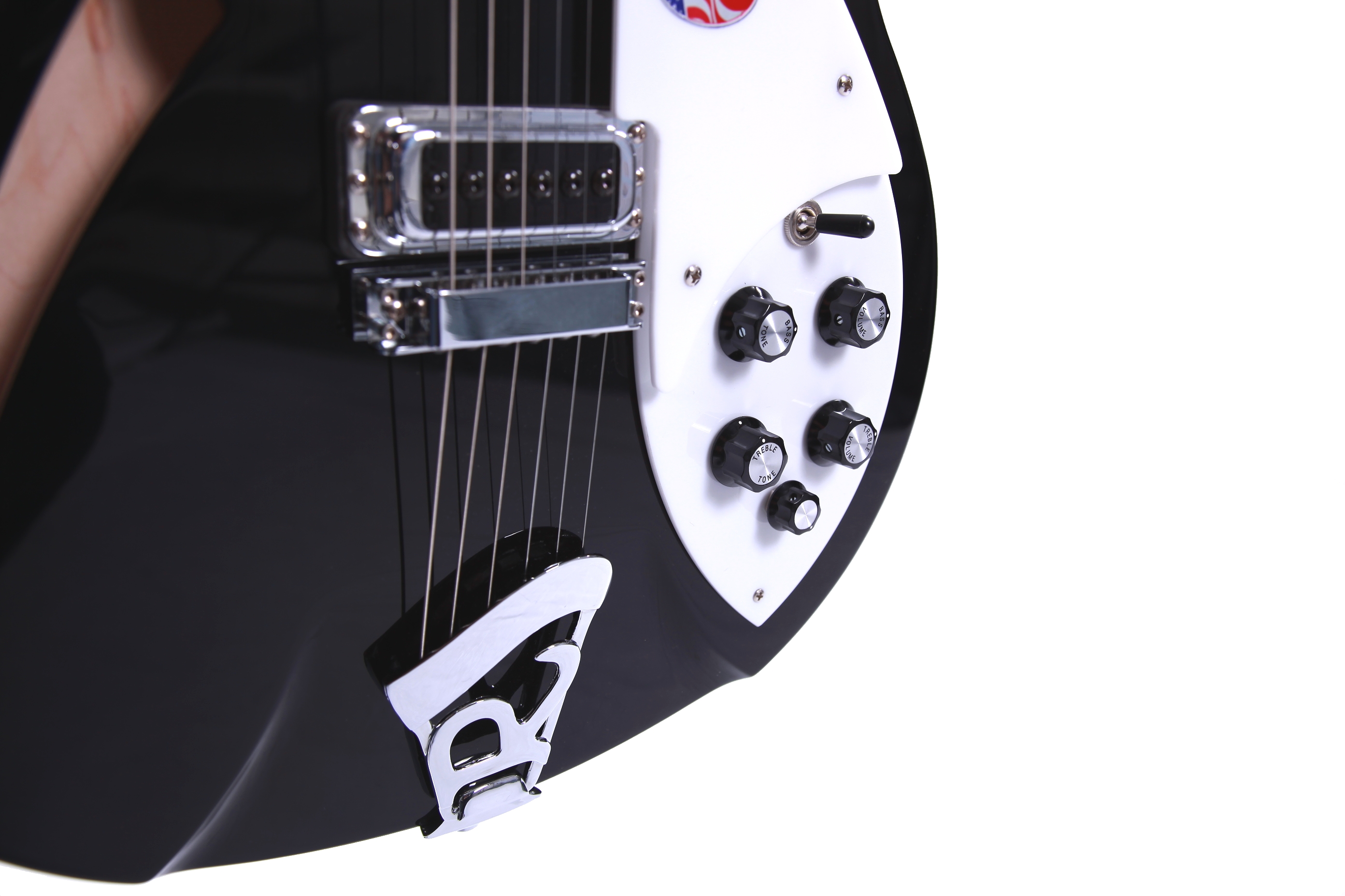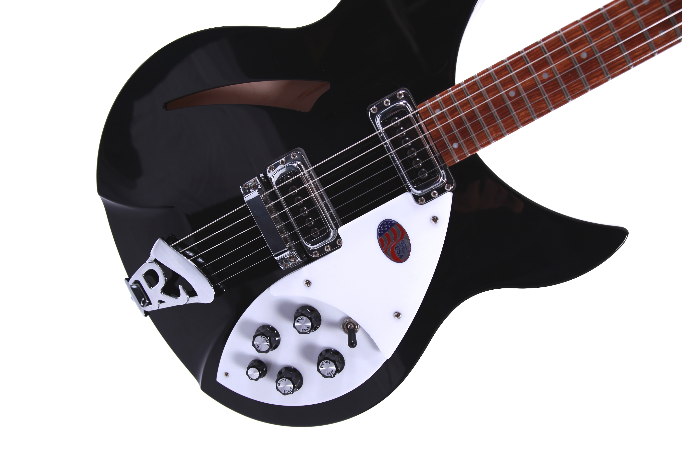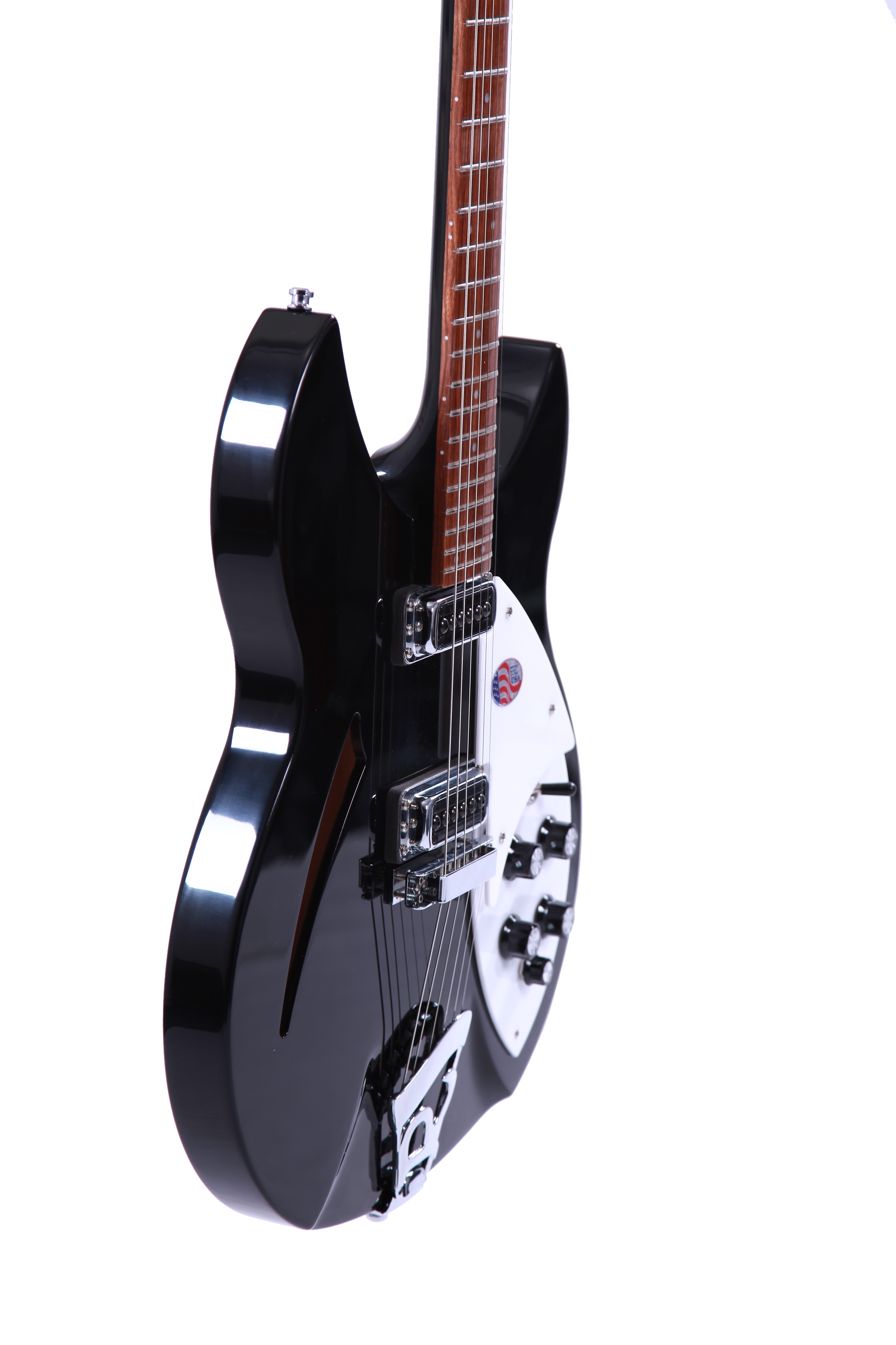 Der warme, volle Klang dieses weit verbreiteten Modells ist das Ergebnis ausgiebiger Forschung auf dem Gebiet der Akustik. Der Klang der zwei Single Coil Tonabnehmer bekommt durch das typische "Rickenbacker-Schallloch" in dem Full-Size-Korpus eine eigenständige Note. Das Griffbrett ist mit 24 Bünden und "Dot-Einlagen" ausgestattet, die zwei tief ausgeschnittenen Cutaways erlauben ein müheloses Spiel bis in die höchsten Lagen. Der Ausgang ist standardmäßig in Mono ausgeführt.