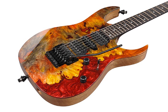 - top/back/body Buckeye Burl (4mm) & Red Resin topBlack Limba body