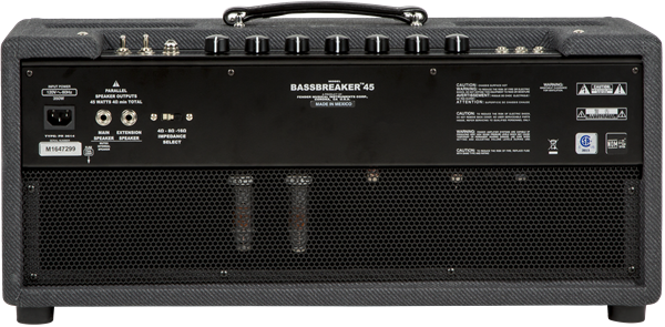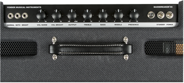 Maximale Flexibilität: Der Bassbreaker 45 Head ist das Flaggschiff der Amp-Flotte und mit dem Großvater fast aller Verstärker verwandt dem 59 Bassman®. Dieses Topteil ist bissig, druckstark und stilvoll, bietet ein extrem breites Dynamikspektrum und neu definierten rauhen Röhrensound. Ein zeitgemäßes, tourtaugliches Biest mit viel authentischem Fender-Feeling. Zwei EL34 Endstufenröhren ergänzen die drei 12AX7 Vorstufenröhren, die man aus dem Bassman kennt. Zu der ungewöhnlichen Bestückung gehört auch ein fliegender Kanalwechsel über den Both-Input für satten Crunch und knackigen Attack. Zusätzlich stehen die Inputs Normal und Bright sowie die traditionellen Tone-Regler zur Verfügung, mit denen der beliebte, zeitlose Fender-Sound erzeugt werden kann. Der Output-Regler differenziert fein von 1 bis 45 Watt. Damit lässt sich der volle, rockige Klang des Bassbreaker 45 Head wohldosiert zähmen und auch in leiseren Einstellungen ohne Gain- oder Bass-Verluste ausgewogen darstellen. Durch den 4-8-16-Ohm Output-Schalter ist er mit nahezu allen Boxen kompatibel. Am besten harmoniert er natürlich mit der Bassbreaker BB-212 Box. Auch optisch beeindruckt der Bassbreaker 45 Head auf der Bühne: dunkel lackiertes Tweed, schwarze Bespannung, weiße Kontrollbeleuchtung und das imposante Fender-Logo in der Mitte. Die großen Regler lassen sich bequem bedienen, wenn schnell der richtige Sound gefunden werden soll. Der Bassbreaker 45 Head ist eine gelungene Hommage an unsere Wurzeln und gleichzeitig zukunftstauglich unverzichtbar für moderne Gitarristen.