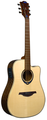 Die Tramontane HyVibe 30 kommt in einem einzigartigen Design. Für die Decke wurde Engelmannfichtenholz verwendet, auf dessen Oberfläche echte Kratzspuren von Bärenkrallen zu sehen sind. Diese machen das Material noch stabiler und sorgen für eine schnell sowie lange ansprechende Klangeigenschaft. Ein besonderes Merkmal dieser Seriengitarre ist ihr integriertes HyVibe-System, wodurch die Gitarre zum selbstständigen Amp wird. Die smarte Technologie sorgt dafür dass die eingebauten Effekte, Loops, Recordings und EQ-Tuner sowohl per App als auch über das LCD-Display an der Gitarre gesteuert werden kann. Über Bluetooth-Verbindung oder Klinkeneingang können sogar ganze Song-Playlists abgespielt werden, wodurch die Gitarre zur Jukebox wird. Das alle funktioniert ganz ohne externes Equipment.
