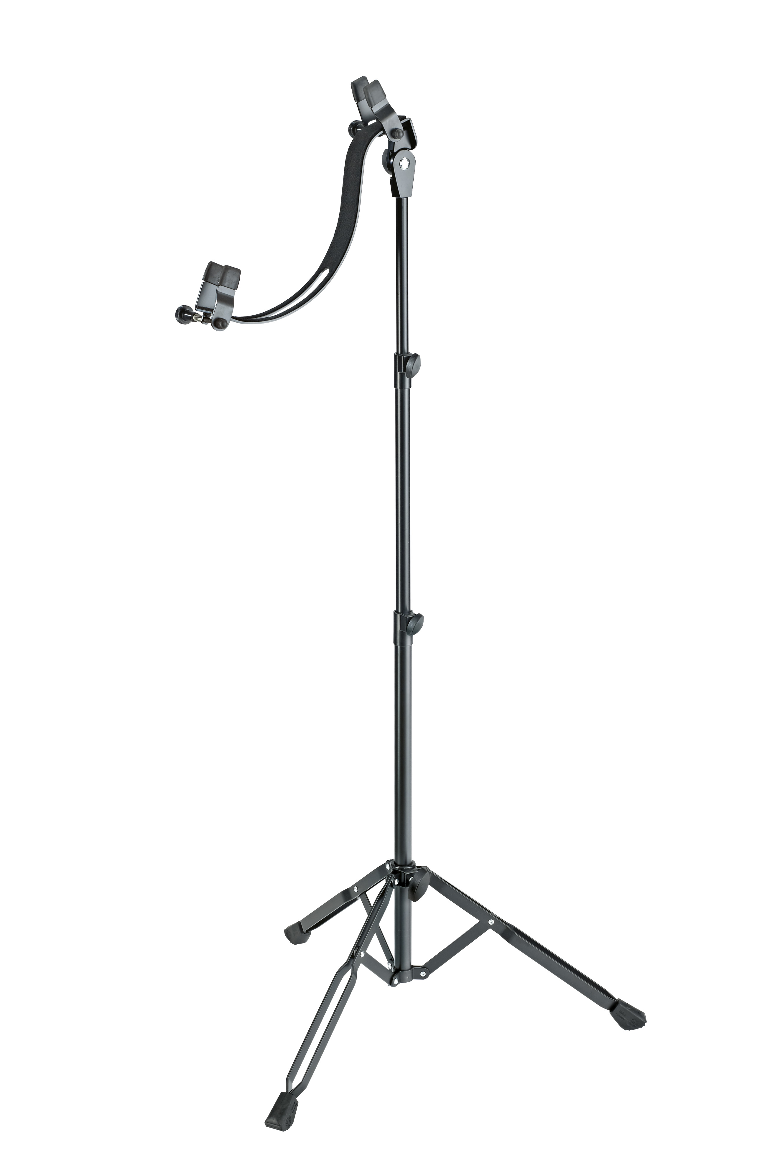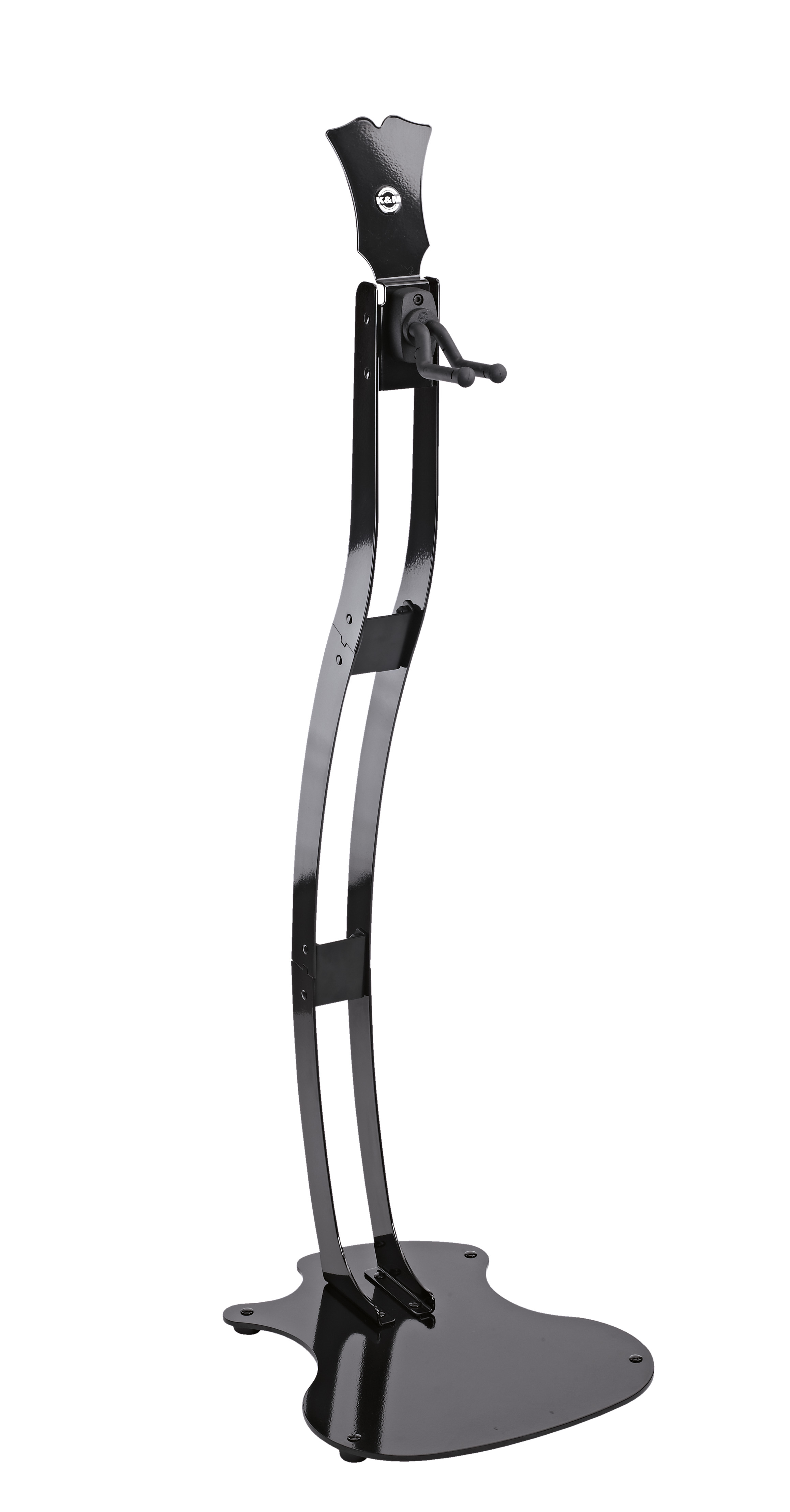 Zusammenlegbarer Ständer für Gitarren aller Art. Mit patentiertem, beweglichem Einhängesystem, dessen Bügel bei Belastung den Gitarrenhals einklemmen und sich bei Entlastung selbst öffnen. Besonders geeignet für asymmetrische Formen. Zapfen an den Bügelenden sorgen für zusätzliche Sicherheit. Höhenverstellbar mittels formschöner Klemmhebel. Verdrehsicheres Auszugsrohr und spezielles Gummipolster zum Schutz der Gitarrenoberfläche. Stabile Fußkonstruktion mit verstärktem Sockel.