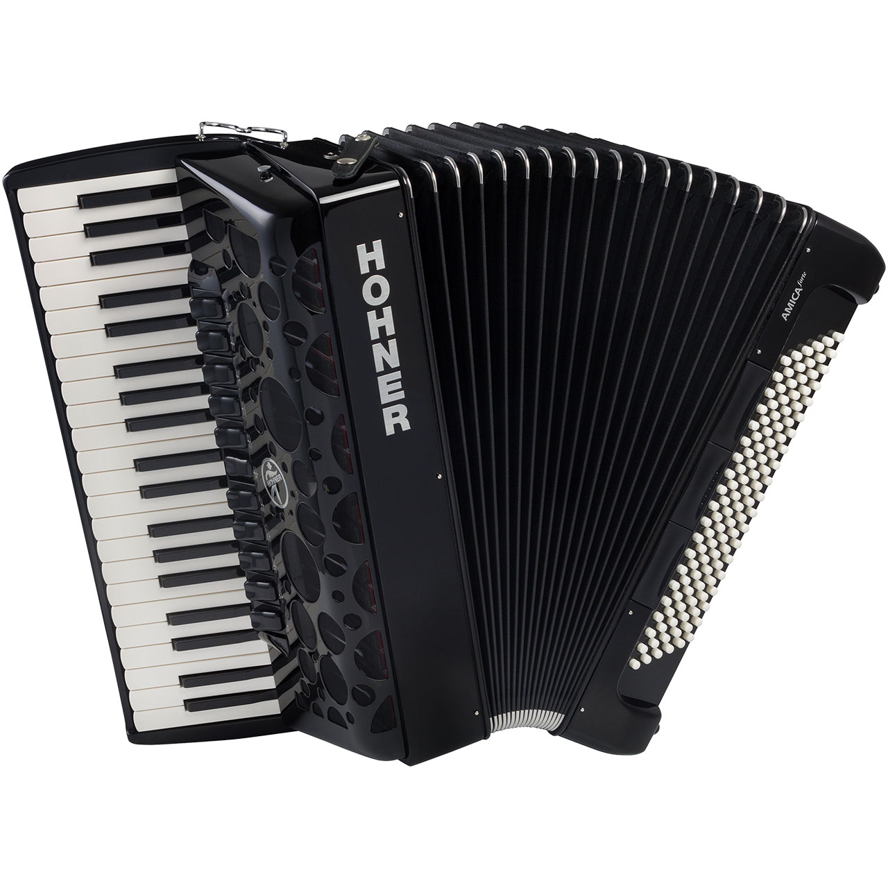 Durch den Schallreflexionskörper erinnert der Klang der AMICA forte an den warmen, satten Klang eines Cassotto Instruments. Gleichzeitig vergößert diese Konstruktion den Dynamikbereich und erhöht die Tonstabilität. Die Tastaturlagerung der AMICA forte mit einem geringen Tastenhub beschert dem Akkordeonisten eine ermüdungsfreiere und fast geräuschlose Tastatur. Die Registerdrücker mit ihrer sensitiven Oberfläche bieten dem Spieler ein angenehmes und treffsicheres Gefühl bei Registerwechseln. Die eloxierte Bassmechanik garantiert nahezu verschleißfreies Gleiten der Fingerschieber. Abgerundet wird die AMICA forte Serie durch ein stabiles Gigbag mit ergonomisch geformtem Griff.