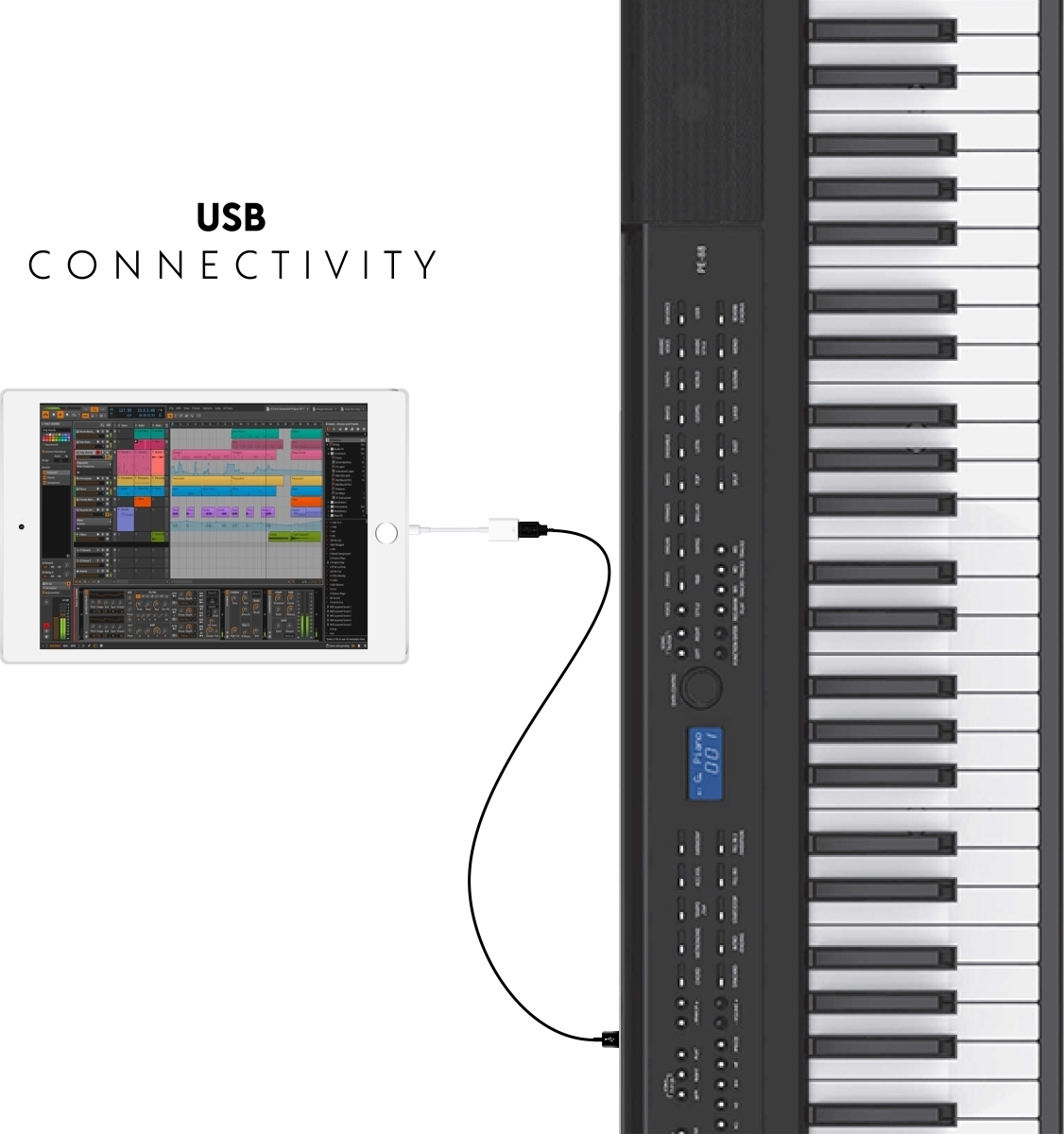 - 88 leichtgewichtete Tasten mit Anschlagdynamik