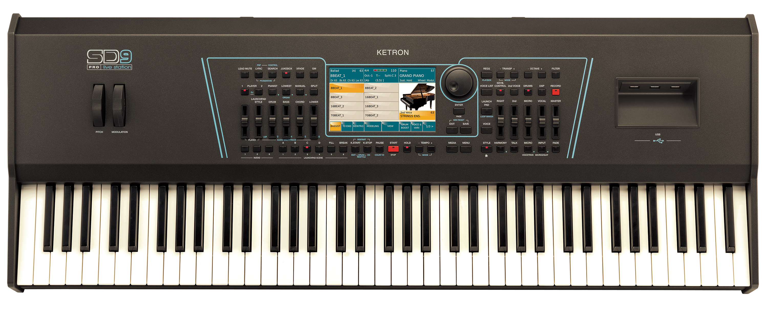 ENTWICKLUNG Die Keyboards von KETRON sind seit je für ihre herausragende Soundqualität und den besonderen Touch ihrer Arrangements/Styles bekannt. Dieser Tradition treu bleibend bringt nun KETRON wieder ein neues Instrument mit einzigartigem musikalischem Charakter, innovativer Technik, neuen Funktionen und neuen Avantgarde-Sounds auf den Markt. Das SD9 ist vollständig mit seinem Vorgänger SD7 kompatibel und ist mehr denn je die richtige Wahl für den professionellen Entertainer, den Home Studio Producer und auch für den Hobbyspieler. SOUNDS Das SD9 zeichnet sich durch 2 brandneue, phantastische Stereo Grand Piano Sounds (Classical und Modern) sowie durch ein neues, authentisches Vintage Electric Piano aus. Dank ihrem kompromisslosen Multilayer Sampling, ihrem langen natürlichen Decay und ihrer extrem hohen Soundqualität überbieten diese Pianos alles, was je auf einem Entertainment-Keyboard geboten wurde. Allein schon wegen diesen Sounds wird dieses Instrument zum absoluten Must-Have für jeden professionellen Spieler und Komponisten. Das SD9 enthält auch eine reichhaltige, erneuerte Sound Library mit neuen Orchesterklängen, einschließlich Electric und FM Pianos, Strings und Brass sowohl als Solostimmen als auch als Ensembles, Bässe, Synths, Gitarren und den Originalsounds der Tonewheel-Orgeln mit echten Samples von Slow und Fast Rotor. Dank ihrer natürlichen Länge und ihres Vibratos ohne Sampling Loops werden es Ihnen einige der neuen Solo-Sounds wie Violin, Flute, Oboe, Soprano, Whistle und Peruvian Flute ermöglichen, ihrem Spiel einen tieferen emotionalen Ausdruck als je zuvor zu verleihen. AUDIO DRUMS Seit der ersten Verwendung in der Audya Serie hat KETRON nicht mehr darauf verzichtet, echte Audio Drums Performances in ihre Arrangements zu inkludieren. Mit dem SD9 erreicht diese Integration nun neue Höhepunkte mit bis zu 250 neuen Audio Drums mit akustischen und elektronischen Loops und einer beeindruckenden Vielfalt von über 400 Latin Percussion Grooves. Das System ist mit den User Audio Drums @ der Serie Audya kompatibel und bietet dem Benutzer die Möglichkeit, neue Custom Audio Drums in das Gerät zu importieren. LIVE GUITARS Das Instrument enthält eine enorme Library mit mehr als 100 neuen Audio Live Guitars. Hierunter befindet sich eine klimpernde Folk Gitarre (die sich hervorragend für unplugged Songs eignet), Rock and Dance Electric Guitars, Gipsy Patterns und halbakustische Grooves für Smooth Jazz. Zusammen mit den Bereichen Audio Drums und Bass bieten die Live Guitars die perfekte Begleitung für Ihre Songs. LAUNCHPAD Das Launchpad ist eine neue Umgebung des SD9, das bisher ungeahnte Möglichkeiten im Bereich der Komposition und moderner Live-Aufführungen bietet. Diese staunenswerte Applikation ermöglicht es Ihnen, bis zu 12 Pads für eine einzelne Szene zu kombinieren, wobei ein jedes Pad als Audio Drum, Bass, Gitarre oder Percussion Groove erklingen kann. Diese Funktion verwendet das interne Modeling oder auch beliebige, in das Gerät importierte externe Wav-Dateien. Es können auch einzelne Bereiche aus den internen Styles importiert werden, oder der Musiker kann seine eigenen Arranger Chord Sequenzen schreiben. Ein zusätzlicher Song Modus ermöglicht einen automatischen Szenenwechsel. Der Benutzer kann kurze Sequenzen in Echtzeit aufnehmen, die mit den anderen Parts synchronisiert und mit hochentwickelten Play Modes gesteuert werden, und hierbei eine schier endlose musikalische Kreativität entfalten. Für jedes einzelne Launchpad Projekt stehen bis zu 6 Szenen zur Verfügung. Es können bis zu 2048 Launchpad Projekte programmiert werden. Im Gegensatz zu anderen ähnlichen Tools ist das SD9 Launchpad vollkommen interaktiv und ermöglicht es dem Spieler, den Grundton seiner Performance ganz einfach dadurch zu wählen, dass er den entsprechenden Akkord spielt. Mit dem Filter und einem dedizierten Tastenfeld ist es möglich, die Sounds eines jeden Pads durch Abänderung des Cut Offs und der Resonance in Echtzeit zu variieren. STYLES Eine großartige Auswahl von über 300 Styles mit Audio Drums und Latin Grooves. Jeder Style bietet 4 Arrangers, 4 oder mehr Fills, 4 Breaks und 3 Intro-Endings mit Drums, Bass, 5 Chords, Groove und 3 Arranger Variations. Neue Live Band und Unplugged Styles mit folgenden Basics: Audio Drums, Live Guitars, Piano und Bass Backgrounds. Sowohl der rechten Hand ( Lead ) als auch den 4 ABCD Arranger Bereichen können 4 verschiedene Klänge zugeordnet werden. Das Arranger System des SD9 ist absolut intuitiv und ermöglicht es Ihnen, die Sounds, Lautstärke und Effekte eines jeden Styles abzuändern und als USER Style abzuspeichern. Auch eine neue Style Editing Funktion ist vorhanden, mit der bis zu 128 Takte aufgezeichnet werden können. Hiermit können Styles von Grund auf neu erstellt oder auch ein bereits bestehender Style abgeändert werden. In MY LIST können Sie bis zu 64 Ihrer beliebtesten Styles speichern und einem sofortigen Zugriff bereitstellen. MODELING Das Modeling ist eine vielfältige Applikation des KETRON Arrangers, die es Ihnen ermöglicht, Hunderte von Templates für Drum, Bass, Piano, Guitar, Synth und andere Orchesterbereiche innerhalb eines Styles auszuwählen und zu steuern. Die Aufsehen erregenden Funktionen des SD7 Modelings wurden im SD9 mit neuen Live Guitars, neuen Bass- und Synthbass-Linien, neuen Synthesizer Sequenzen und sogar neuen Audio Drums noch weiter ausgebaut. Aber das ist noch nicht alles in die Modeling-Funktion können Sie auch Ihre eigenen, von Ihnen erstellten MidiSequenzen importieren und innerhalb des Arrangements verwenden. Die Modeling-Funktion macht das Erstellen von persönlichen Styles so einfach und kreativ wie nie zuvor. USER MEMORY/SAMPLE EDITOR Für die Custom Sounds und zusätzliche KETRON Libraries wurde ein äußerst umfangreicher Speicherplatz von bis zu 700 Mbyte (überschreibbar) zur Verfügung gestellt. Das SD9 kann regelmäßig mit neuen Sounds, Drums Samples oder Ar