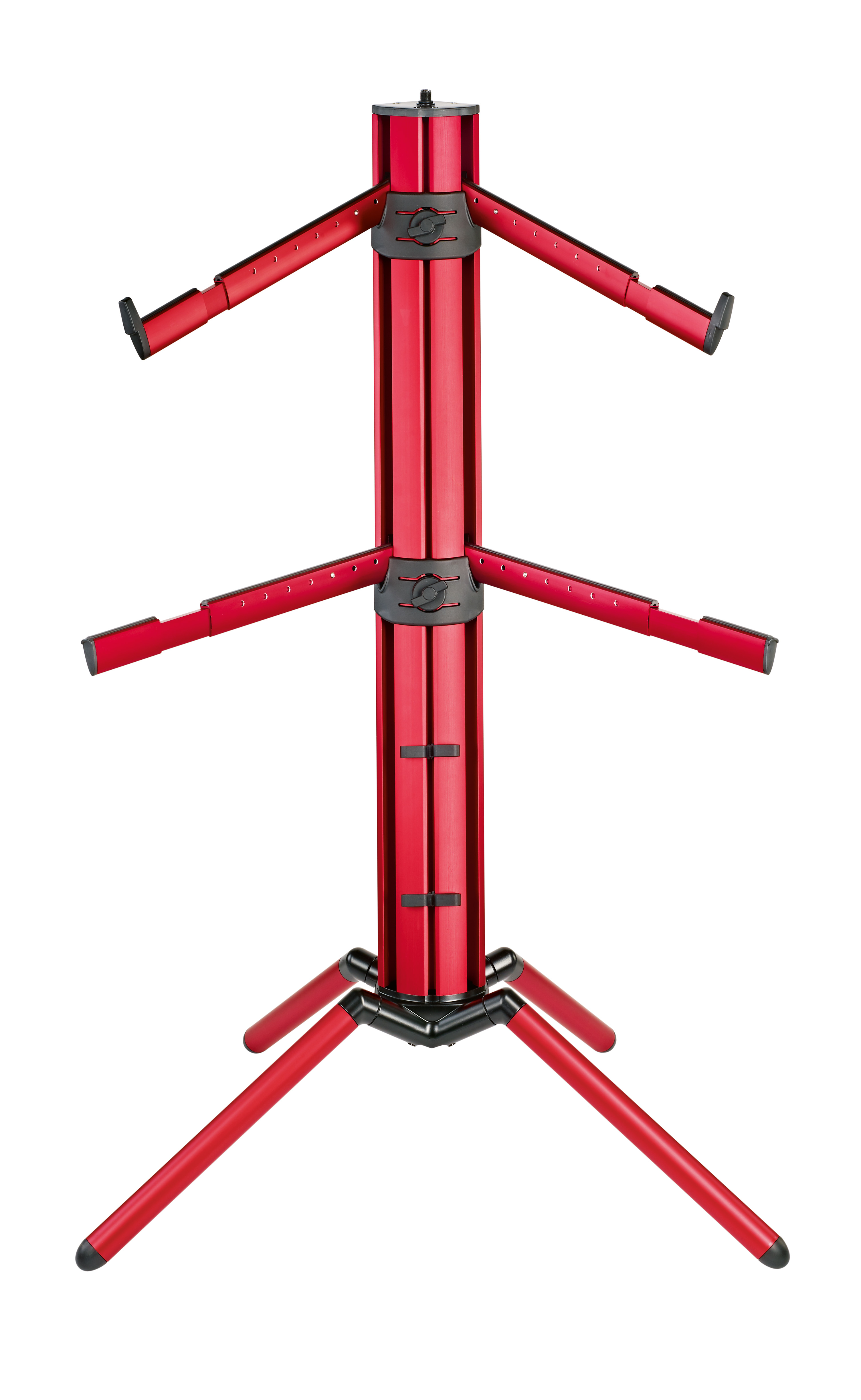 Der »Spider Pro« ist mit zwei Paar ausziehbarer und stufenlos höhenverstellbarer Auflagearme ausgestattet (das obere Paar Auflagearme ist um 15° geneigt). Er kann optional mit einem dritten Paar Auflagearme (Artikel 18865 oder 18866) für ein weiteres Keyboard aufgerüstet werden. Zusätzlich verfügt der »Spider Pro« am oberen Ende der Säule über einen 3/8" bzw. 5/8" Gewindeanschluss zum Anbringen eines Mikrofonarms. Eine verstärkte Schrägstellung der Säule ermöglicht ein bequemeres Spielen und bessere Sicht auf das untere Keyboard. Die klappbare Fußkonstruktion bietet viel Platz für Pedale und optimale Beinfreiheit. Der »Spider Pro« lässt sich schnell und kompakt zusammenlegen. Die optional erhältliche Tasche (Artikel 18851) bietet Schutz und sorgt für einen einfachen Transport des Ständers