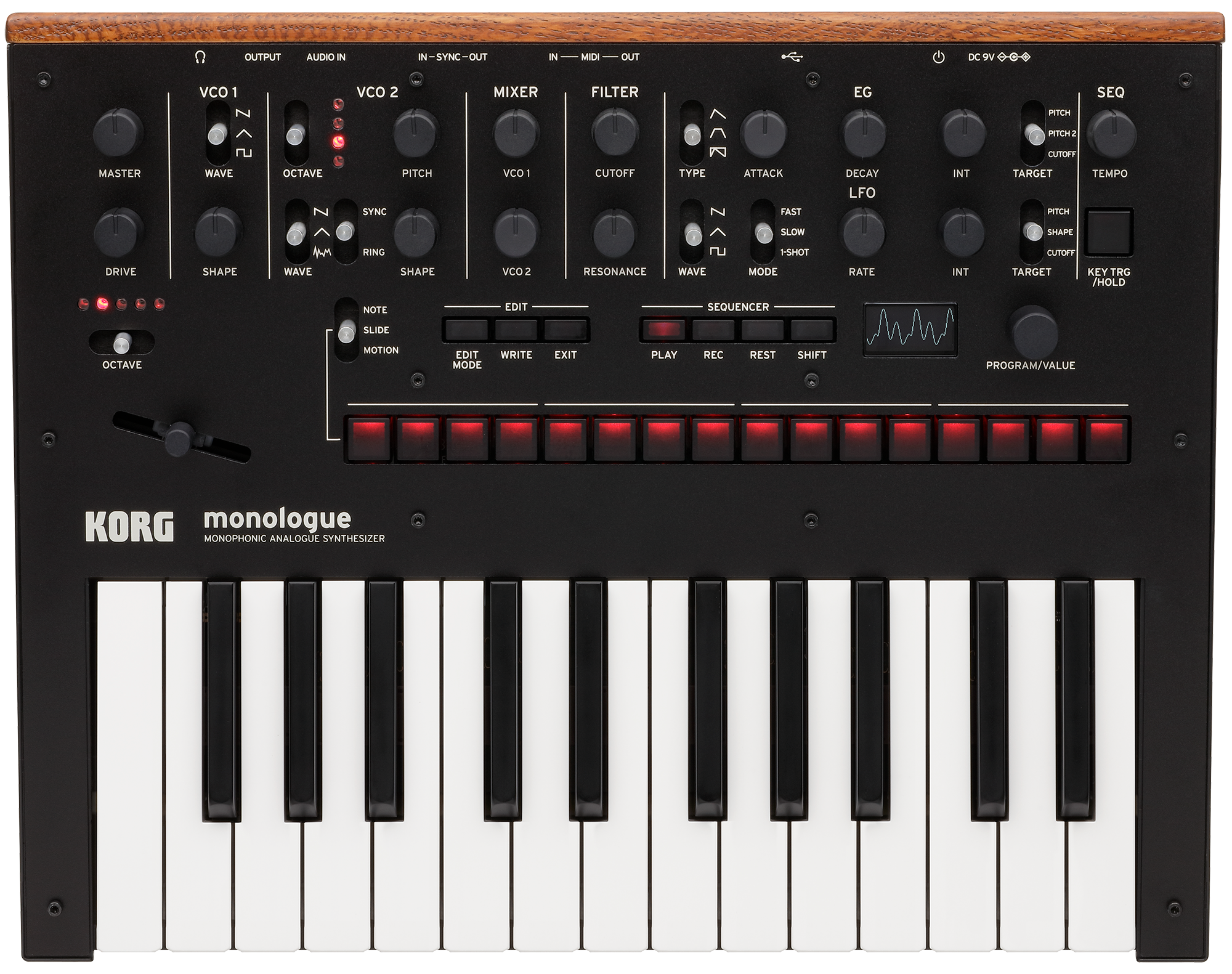 2 digitally controlled analog oscillators (DCOs) per voice (plus sub octave on oscillator 1) with selectable sawtooth, triangle, saw/triangle mix, and pulse waves (with pulse-width modulation)