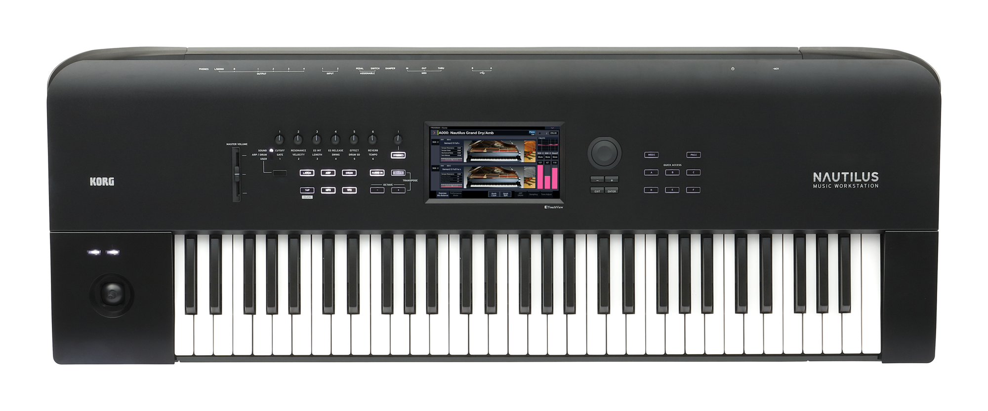 Auf den Spuren der Titanen bedient sich der KORG NAUTILUS den legendären neun Sound-Engines des KORG KRONOS und bietet ein komplett neues und sehr übersichtliches Bedienkonzept. Das schlichte und elegante Design der Synthesizer-Workstation garantiert eine hervorragende Übersicht aller Bereiche, schnellen Zugriff auf exzellente Klänge sowie flexible Funktionen bei höchstem Bedienkomfort. Der NAUTILUS AT ist im Gegensatz zum Standardmodell mit einer zusätzlichen Aftertouch-Funktion ausgestattet, die es erlaubt, gespielten Klängen durch erneute Druckausübung auf die Tasten lebendige Modulationen hinzuzufügen. Um diese besonders ausdrucksstarke Spielweise zu unterstützen, wurden alle Soundprogramme des NAUTILUS AT auf seine Aftertouch-Funktionalität hin optimiert, wodurch sich das volle Potenzial seiner neun mächtigen Sound Engines entfalten lässt. Die Klänge des in Japan gefertigten Synthesizers sind in drei wichtige Kategorien unterteilt und verleihen dem Instrument mit standard, aktuellen und einzigartigen Sounds einen unverwechselbaren Charakter. Die neuste Prozessorgeneration holt aus den neun weiterentwickelten Sound-Engines weitaus mehr heraus, als dies jemals zuvor möglich war. Die aus dem KRONOS bekannte SGX-2 Piano-Sound-Engine wurde im NAUTILUS durch zusätzliche Flügelsounds erweitert und bietet neben wunschgemäßer Einstellung von Saitenresonanzen und einer Abstufung in 12 unterschiedliche Velocity-Stufen auch die Möglichkeit, die Saalakustik des jeweiligen Instruments zu verändern. Die SGX-2 und alle weiteren Sound-Engines, wie die EP-1 Electric-Piano-Engine, die CX-3 Drawbar-Engine, die HD-1 PCM-Engine, die MS-20EX Analog-Modeling-Engine, die PolysixEX Modeling-Engine, die AL-1 Analog-Modeling-Engine, die MOD-7 VPM/FM-Sound-Engine und die STR-1 Physical Modeling-Engine sowie sämtliche dazugehörigen Parameter lassen sich über das 7 große TouchView-Display mit 800 x 480 Pixel Auflösung oder aber auch über die versenkbaren Drehregler im Bedienfeld bestens konfigurieren. Benötigt man einmal Hilfe, den entsprechenden Klang im Instrument zu lokalisieren, erleichtert die Such- und Vorhörfunktion das Durchforsten sämtlicher Klänge, die auf über 1.770 Multisamples beruhen. Die eigenen Lieblingssounds und Combinations, die man oft benötigt, lassen sich mittels Sternchen in eine Favoriten-Liste speichern. So hat man blitzschnell seine favorisierten Klänge zur Hand. Genauso bietet der NAUTILUS sechs frei programmierbare Quick-Access-Taster, die auf direktem Weg zu bestimmten Menüs oder Funktionen führen können. Vier vorgegebene Einstellungen und vier User-Belegungen stehen hier zur Verfügung. Ein polyphoner Arpeggiator mit über 1.500 Presets, ein Drum-Track mit über 1.200 Pattern und ein Step-Sequenzer stehen in jedem Modus bereit und werten Ihre Performances im Verbund mit den neuen Klängen zeitgemäß auf. Sämtliche Einstellungen lassen sich perfekt für den Live-Einsatz konfigurieren, abspeichern und im Set-List-Modus später wieder aufrufen. Eine unverzichtbare Funktion im Live-Betrieb. Auch die insgesamt 16 Effektprozessoren und der 3-Band EQ für jeden einzelnen Track sind dank des neuen Bedienkonzepts einfach zu erreichen. Die Expressivität eines Klangs kann zudem mit dem separaten Dynamics-Regler im Bedienfeld der jeweiligen Anforderung perfekt angepasst werden. So lassen sich Klänge im Nu entweder sehr dynamisch und elegant oder druckvoll mit weniger Dynamikumfang spielen, um sich so besser durchzusetzen. Zusätzlich liegt dem Instrument ein Download-Code für ein umfangreiches und kostenloses Zusatzsoftware-Angebot bei. Das KORG Software Bundle enthält unter anderem die Software Ozone Elements von iZotope, ein Probe-Abo für die Online-Piano-Schule Skoove sowie Software-Synthesizer von KORG und weiteren Herstellern.