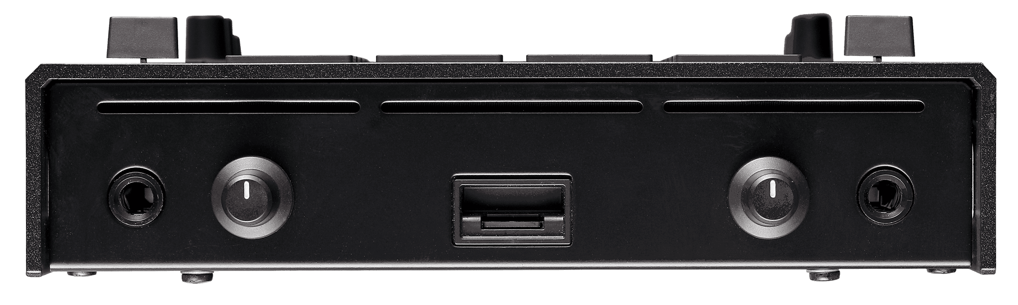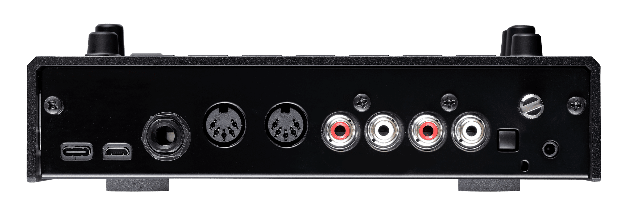 - Anschlüsse: LINE/PHONO (Cinch, umschaltbar mit schaltbarem PHONO GAIN), Mikrofon (6,3 mm Klinke, mono, nur für dynamische Mikrofone geeignet), AUX IN (3,5 mm Miniklinke, stereo), LINE OUT (Cinch), Kopfhörer (6,3 mm Klinke, stereo), Fußtaster-Eingang (6,3 mm Klinke, mono), MIDI IN/OUT (Din 5-Pol), USB-MIDI (1 x IN, 1 x OUT)