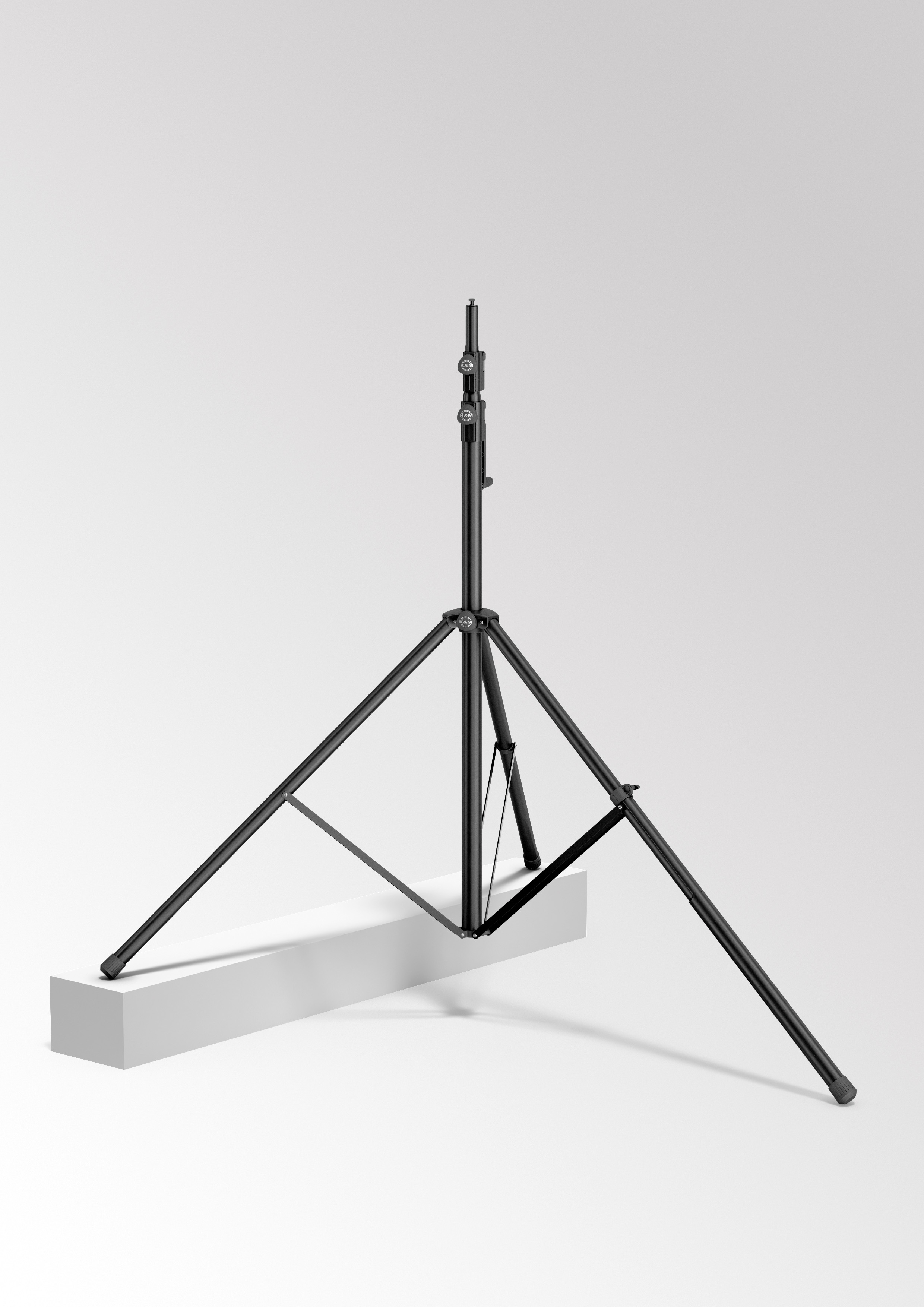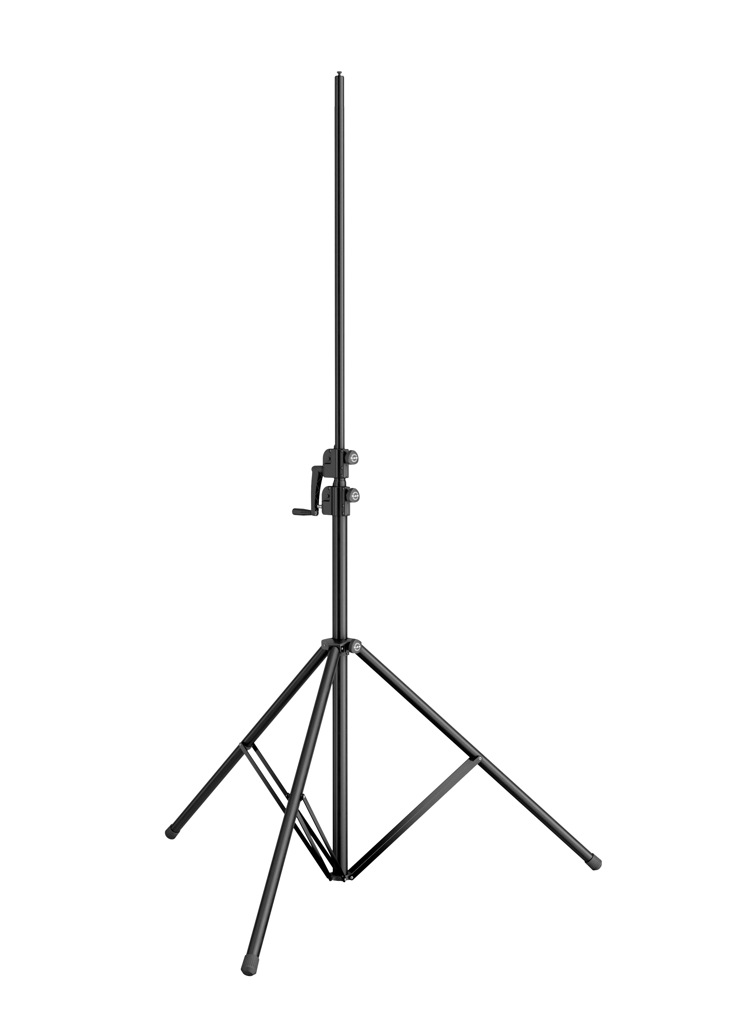 Professionelles patentiertes Leuchten- und Boxenstativ mit neuartigem doppeltem Kurbelgetriebe. Die zweifach ausfahrbare Rohrkombination deckt einen Einsatzbereich von 1.715 bis 4.000 mm Höhe ab. Das Heben und Senken der Last erfolgen benutzerfreundlich, sicher und zuverlässig über zwei separate Kurbelgetriebe. Durch das integrierte »Auto Lock« System wird ein plötzliches Absacken der Last durch eine automatische Verriegelung verhindert. Die Kurbel kann zudem gegen unbefugte Benutzung entnommen werden. Da keine Seilzüge zum Einsatz kommen, arbeitet das Stativ völlig wartungsfrei. Der Fokus bei diesem robusten Stativ liegt vor allem auf Stabilität und Kippsicherheit, sodass eine Traglast von 40 kg problemlos realisiert wird. Das kompakte Transportmaß beträgt 1.695 x 200 x 165 mm und das Gewicht liegt bei rund 14,2 kg. Über die integrierte Gewindebuchse M10 können zusätzlich Traversen oder einzelne Schweinwerfer direkt montiert werden.