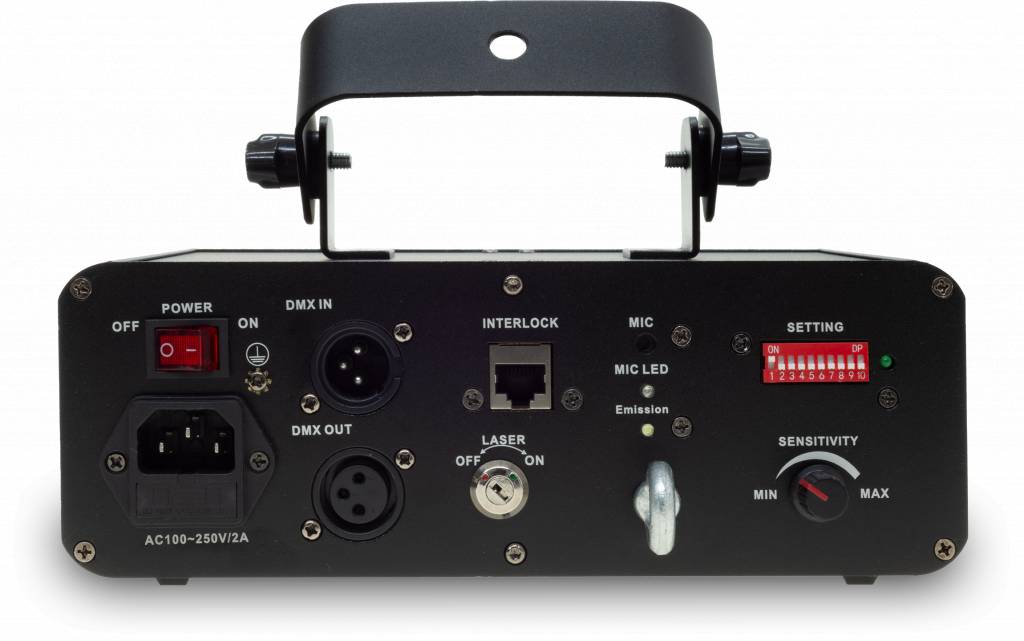 Die rote Laserdiode mit einer Wellenlänge von 650 nm, das grüne DPSS Lasermodul mit einer Wellenlänge von 532 nm und die royal-blaue Laserdiode mit einer Wellenlänge von 445 nm gewährleisten helle Strahlen und schöne Farben. Die Laserstrahlen haben einen Durchmesser von ca. 3 mm und eine Strahldivergenz von ca. 2 mrad. Der Projektor besitzt ein Hochgeschwindigkeitsmotoren bis zu 3-8kpps-System. Etwa ca. 50 (Ebenen, Tunnel, Gitter, Wellen, etc.) Basiseffekte können über DMX angesteuert werden, darüberhinaus sind aber auch ein Musikmodus und ein Automatikmodus verfügbar. Für den Musikmodus kann die Sensitivität des integrierten Mikrofons angepasst werden.