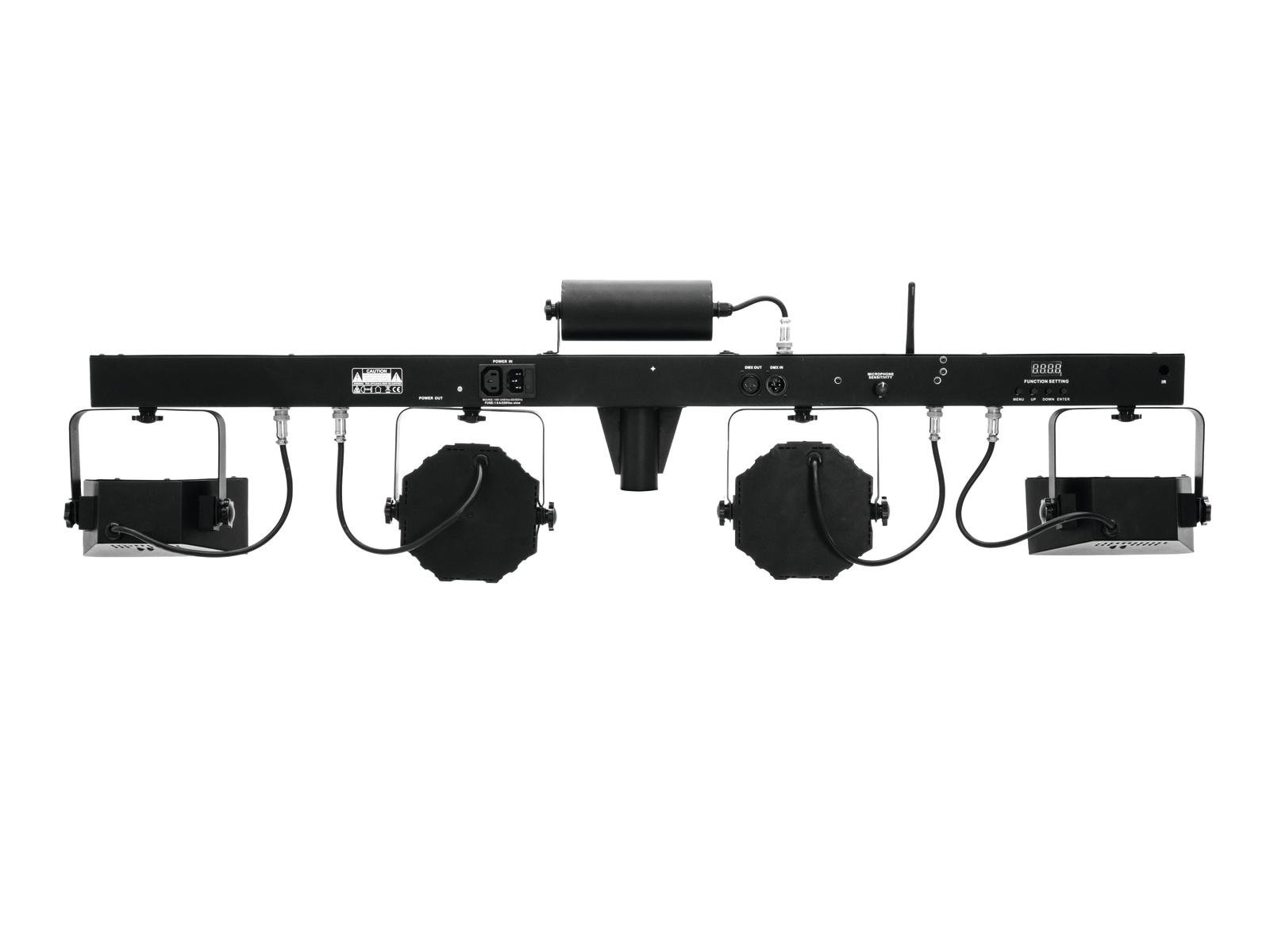 4-in-1-DMX-Lichteffektleiste mit Laser, 2 rotierenden LED-Derbys, 2 LED-Spots und weißen Strobe-LEDs