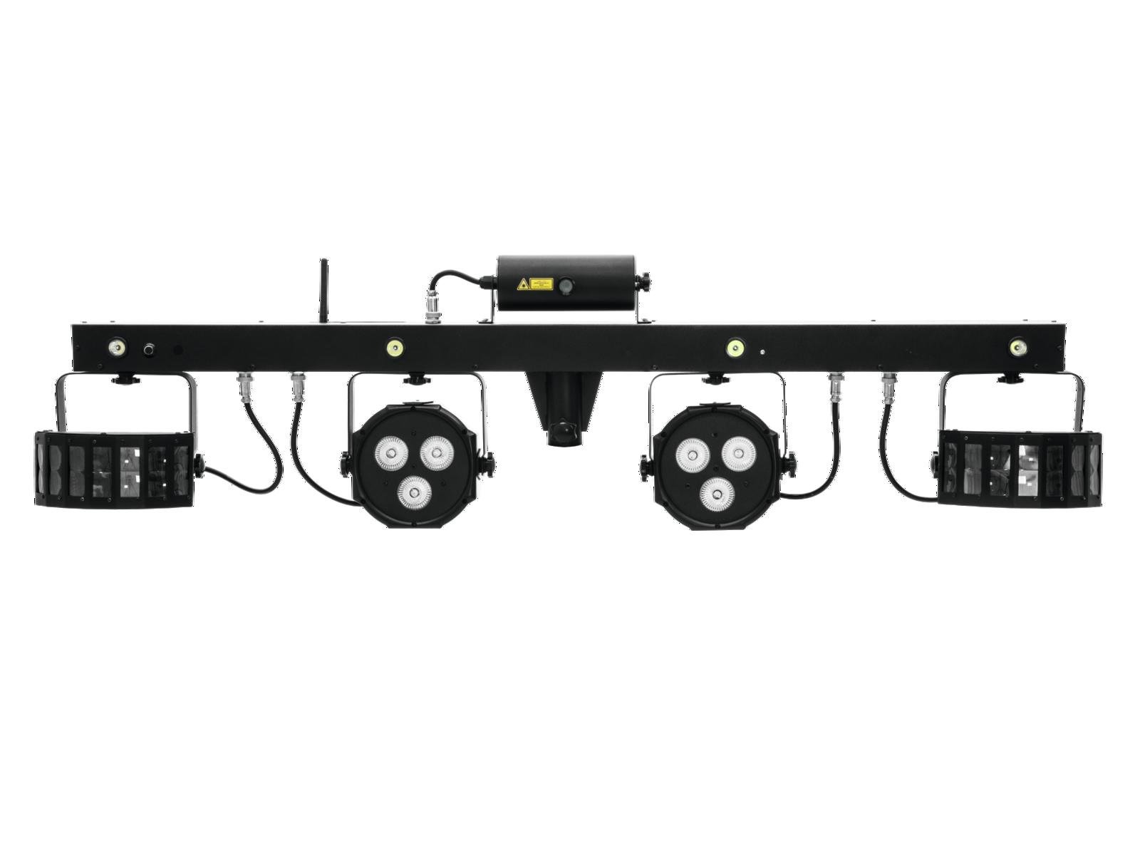 - 4-in-1-DMX-Lichteffektleiste mit Laser, 2 rotierenden LED-Derbys, 2 LED-Spots und weißen Strobe-LEDs
