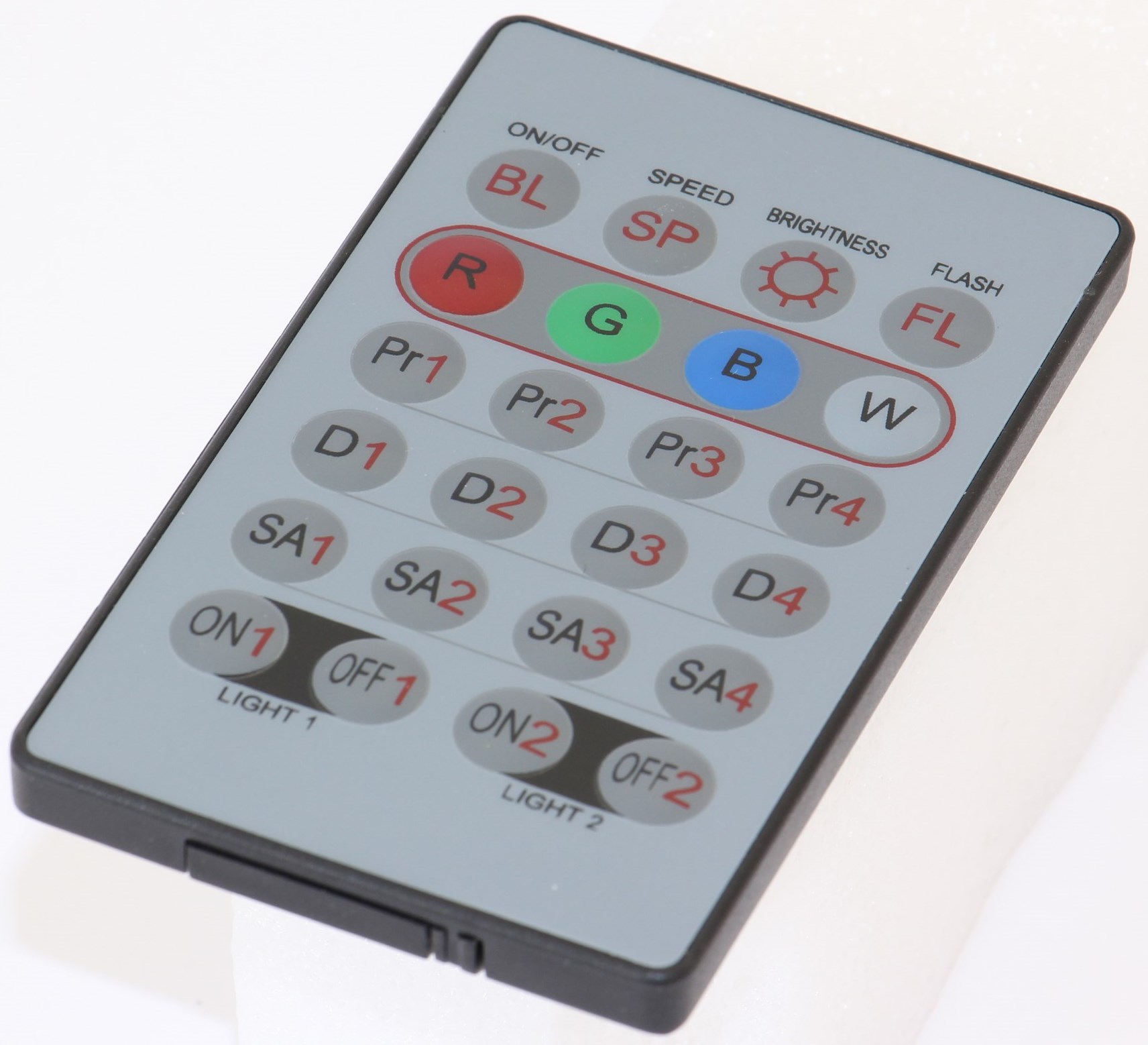 - Standalone mit IR-Fernbedienung: Automatische / Takt-synchronisierte Farbmuster + Ein/Aus-Steuerung von 2 (optionalen) Beleuchtungseffekten.