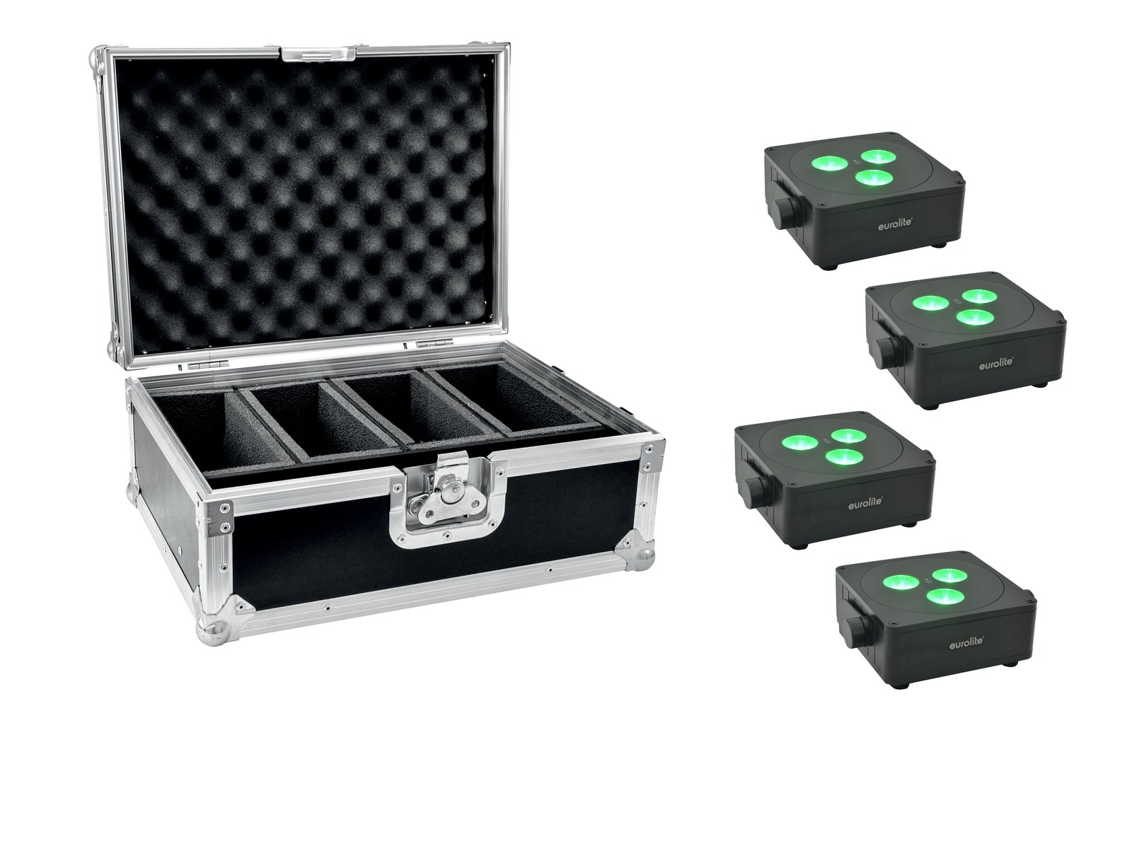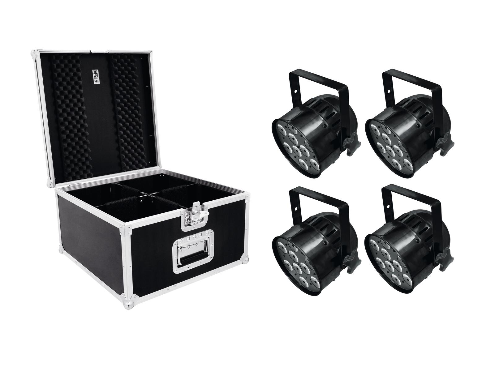 Set bestehend aus: 4x 51914027: EUROLITE LED PAR-64 HCL 12x10W Floor sw 1x 31000800: ROADINGER Flightcase 4x PAR-64 Spot kurz 51914027 EUROLITE LED PAR-64 HCL 12x10W Floor sw PAR-Scheinwerfer mit 12 x 10-Watt-6in1-LED in R, G, B, A, W, UV