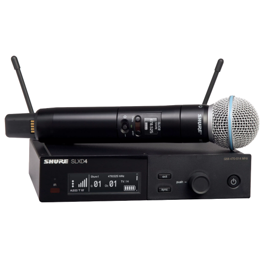 SLX-D drahtloses digitales Mikrofonsystem bestehend aus einem SLXD4 Empfänger mit 19"-Montagezubehör und einem SLXD2 Handsender mit Beta58A Mikrofonkapsel (dynamisch, Superniere).