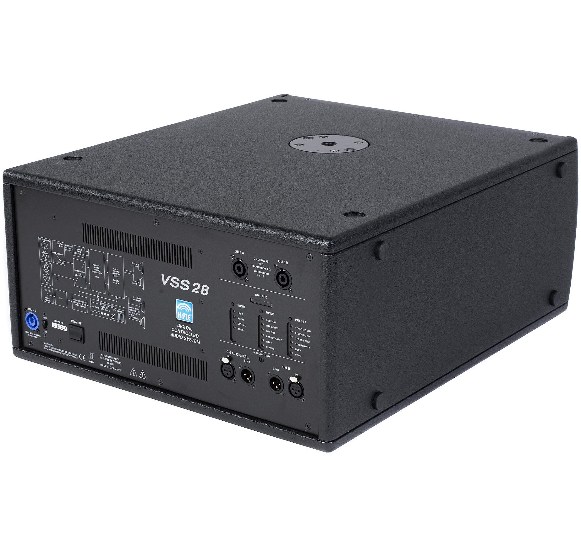 Der VSS 28 ist eine vollständig digitale Systemeinheit mit integriertem 2 x 8" direkt abstrahlendem Subwoofer. Er kombiniert digitale Verstärkertechnologie mit einem leistungsfähigen DSP, Schaltnetzteil mit PFC und hochbelastbaren Neodymtreibern in einem enorm kompakten und extrem leichten Gehäuse.