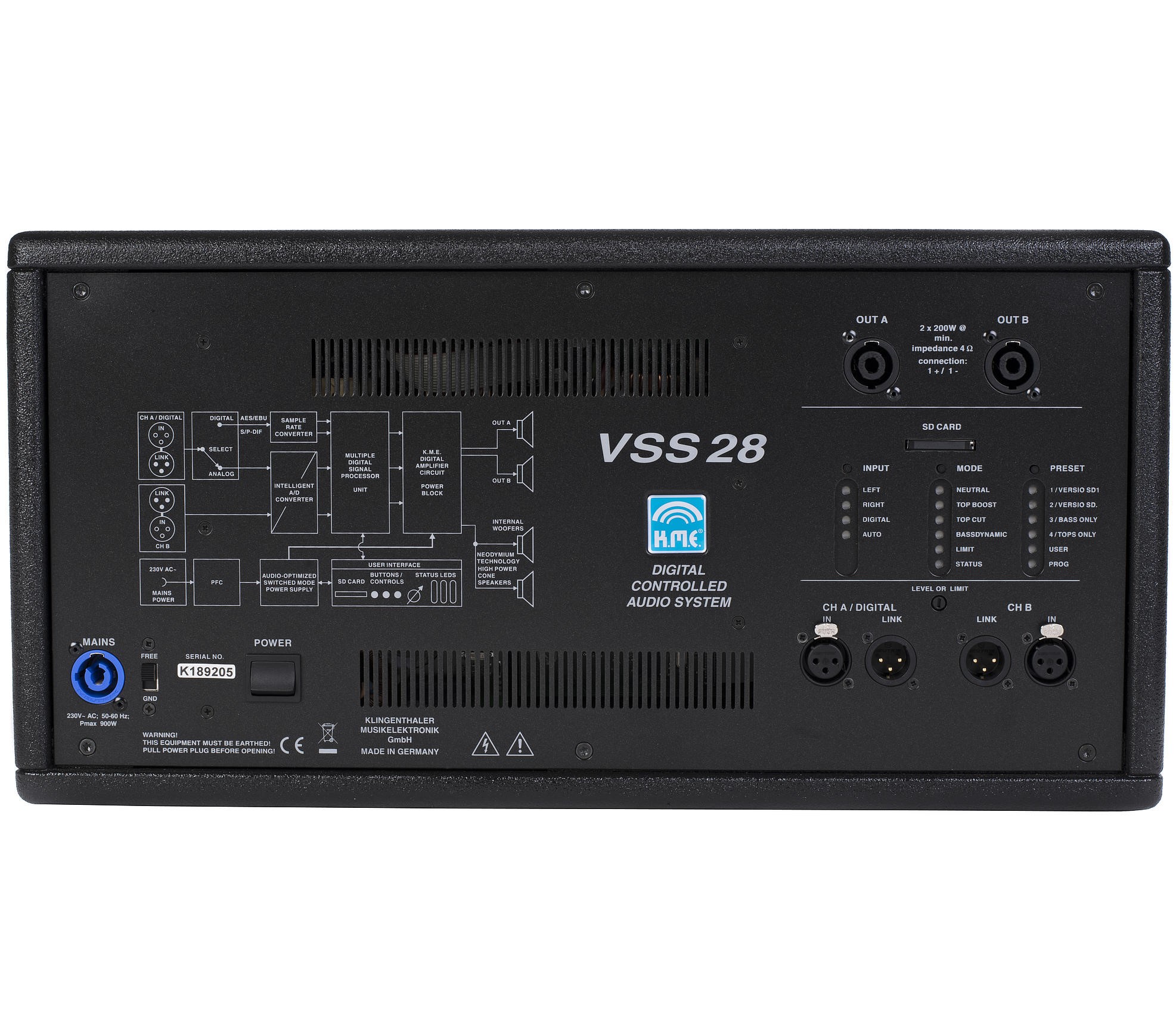 - Ausstattung (elektronisch) Ground-Free Schalter, einstellbarer Gain, digitale Crossover (80–160 Hz), Subsonic-Filter, parametrische EQs, Peak-RMS-Limiter, Delays (0–1000 ms)