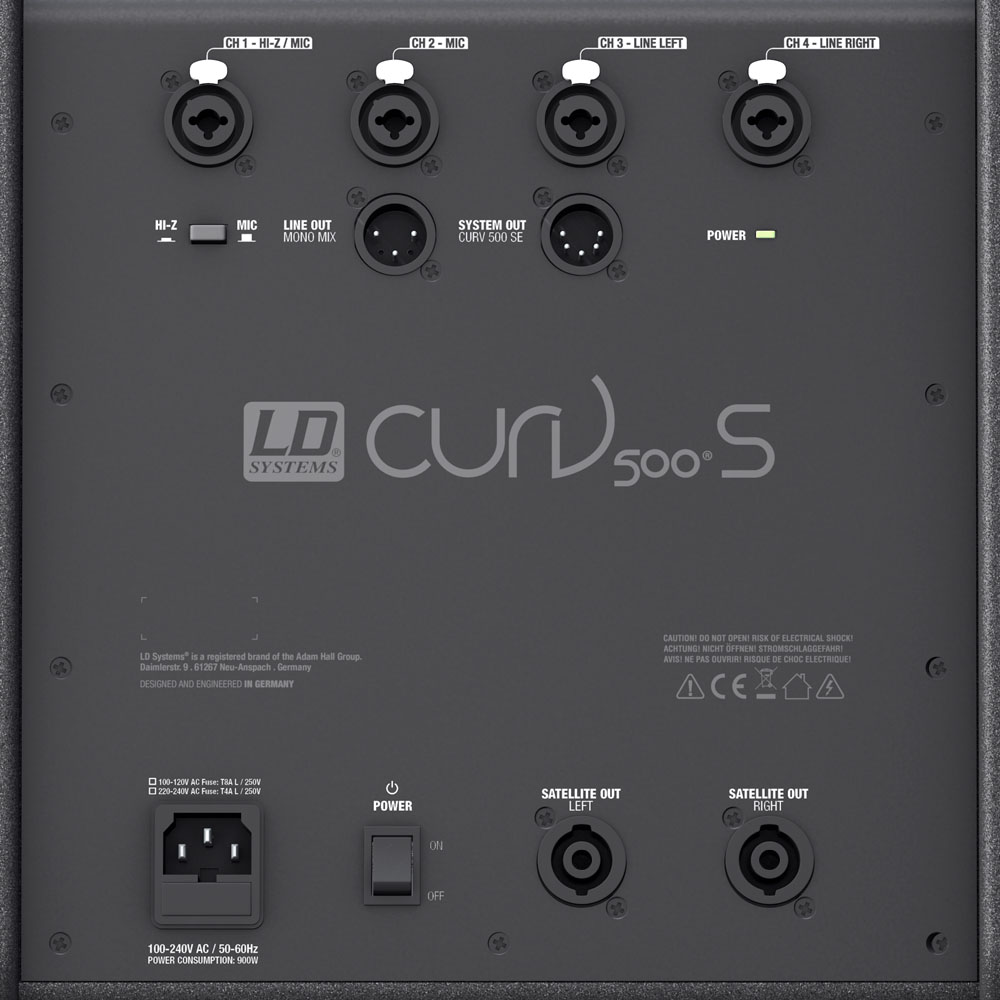 Das kompakte, besonders transportfreundliche CURV 500 ist ein leicht konfigurierbares Array-System mit maximal 4 ineinander verriegelnden Satelliten, die an einem SmartLink®-Adapter betrieben werden. Die nur 12 x 12 cm großen Elemente sind mit LD Systems eigener WaveAhead®-Technik ausgestattete, ein 4" und drei 1" Treiber sorgen für eine kohärente und extrem detaillierte Wiedergabe mit hohem Druck und Dynamik. Der 10" Bassreflex-Subwoofer beherbergt die Class-D-Verstärkung des CURV 500 mit Limiter, Schutz gegen Kurzschluss, Überhitzung und Überspannung sowie einen 4-Kanal-Mixer mit 16 digitalen Effekt-Presets und Bluetooth®. Combo- und speakON-kompatible Buchsen bieten umfangreiche Anschlussmöglichkeiten, dazu besitzt der Subwoofer 4 digitale System-Presets, einen M20-Gewindeflansch und 3 ergonomische Tragegriffe. In 3 Sets für den mobilen und fixen Einsatz erhältlich, zeichnet sich die bequeme Gesamtlösung CURV 500 durch geringes Gewicht und eine breite, weitreichende Abstrahlung aus. Zum CURV 500 Entertainer Set mit 460 Watt RMS-Leistung und einem maximalen Schalldruck von 128 dB gehören ein SmartLink®-Adapter, Distanzstange und Lautsprecherkabel.