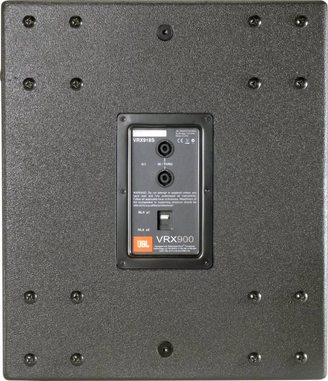 Das Multiplexgehäuse ist JBL typisch mit der robusten DuraFlex-Lackierung beschichtet. Zur Anpassung an verschiedene Verkabelungssysteme kann die Pin-Belegung der vierpoligen Speakon-Buchse umgeschaltet werden. Rückseitig sind bereits Einschlagmuttern zur Montage von Rollen vorgesehen.