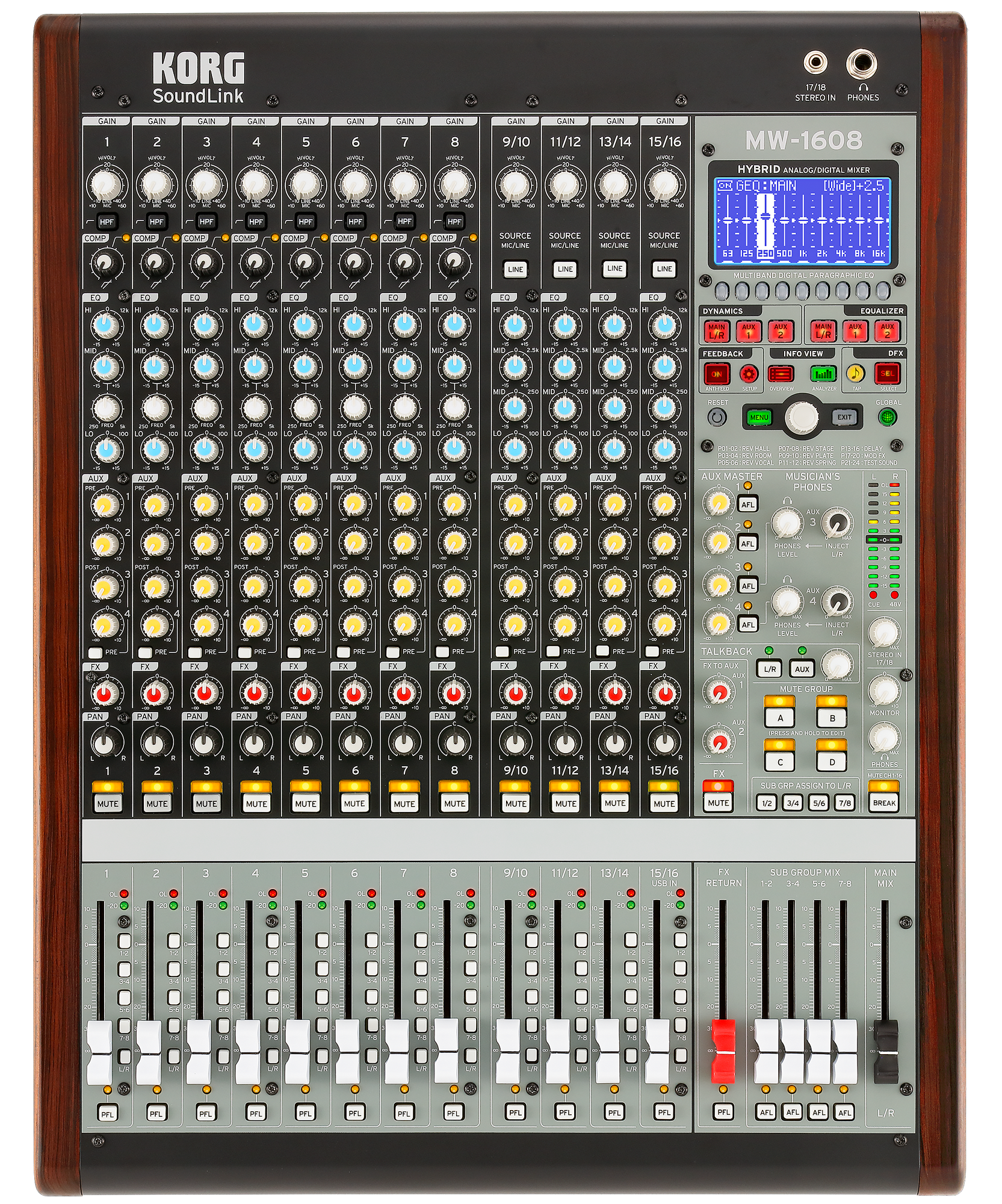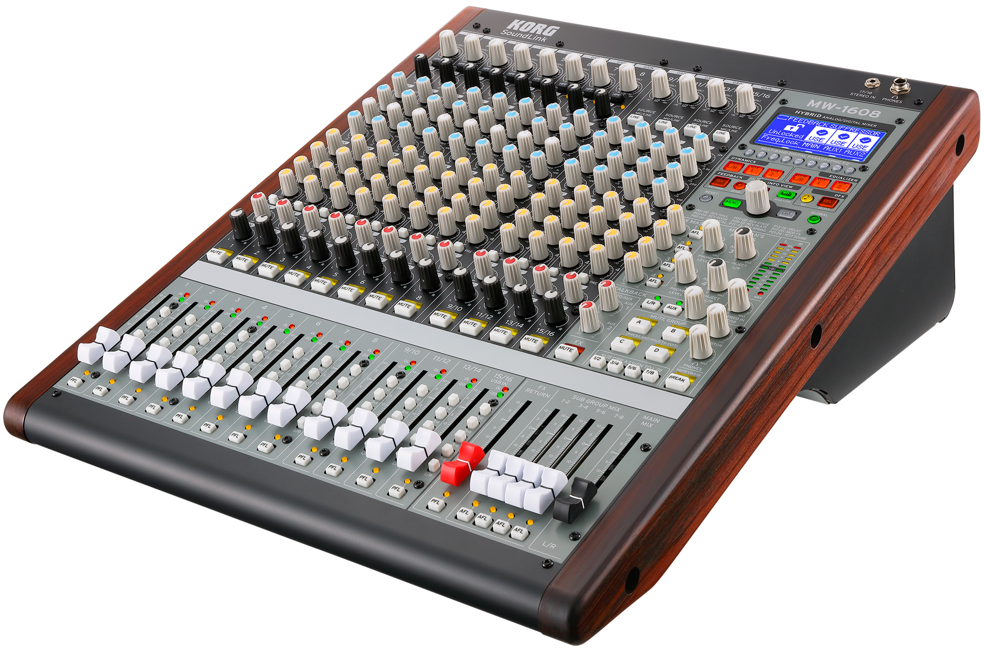 Nicht nur der Klang sondern auch die Bedienbarkeit eines Mixers ist wichtig, gerade dann, wenn es auf der Bühne schnell gehen muss. Korg hat sich mit zwei Koryphäen des Mixer-Designs Greg Mackie und Peter Watts für die Entwicklung von Hybrid Analog/Digital Konsolen zusammengetan. Das Ergebnis, dieser schon vor einem Jahr angekündigten Kooperation, sind portable Mixer mit großartigen Features, die man normalerweise nur aus großen Mischpulten kennt. Edler Sound kombiniert mit High-End-Technologie. Sowohl die 24- als auch die 16-Kanal-Ausführung bietet einen schnörkellosen, analogen Bedienkomfort und die Zusatzfunktionen sind voll und ganz auf Musiker zugeschnitten.