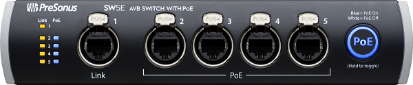 Der PreSonus SW5E ist ein 5-Port AVB-Switch. Über vier Ports können PoE-kompatible Geräte über Power over Ethernet mit Strom versorgt werden. Der fünfte Port bietet kein PoE und dient zum Anschluss weiterer Switches. Der Switch verfügt über ein robustes Metallgehäuse und lässt sich bei Bedarf über einen (optional erhältlichen) Rack-Einschub im Rack montieren. Sämtliche Ports des SW5E sind mit sicheren, robusten Ethercon-Buchsen für den Einsatz im Live-Bereich ausgestattet.
